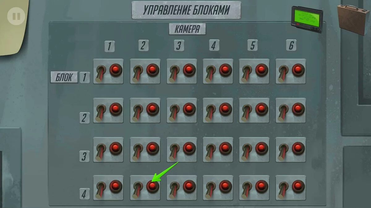 Ставим лестницу у стены справа, проталкиваем крысу в решётку. Ослабляем её гаечным ключом и забираемся наверх. Используем кассету на плеер и нажимаем кнопку записи. После этого нажимаем «Воспроизвести». Открываем камеру «2» в блоке «4».