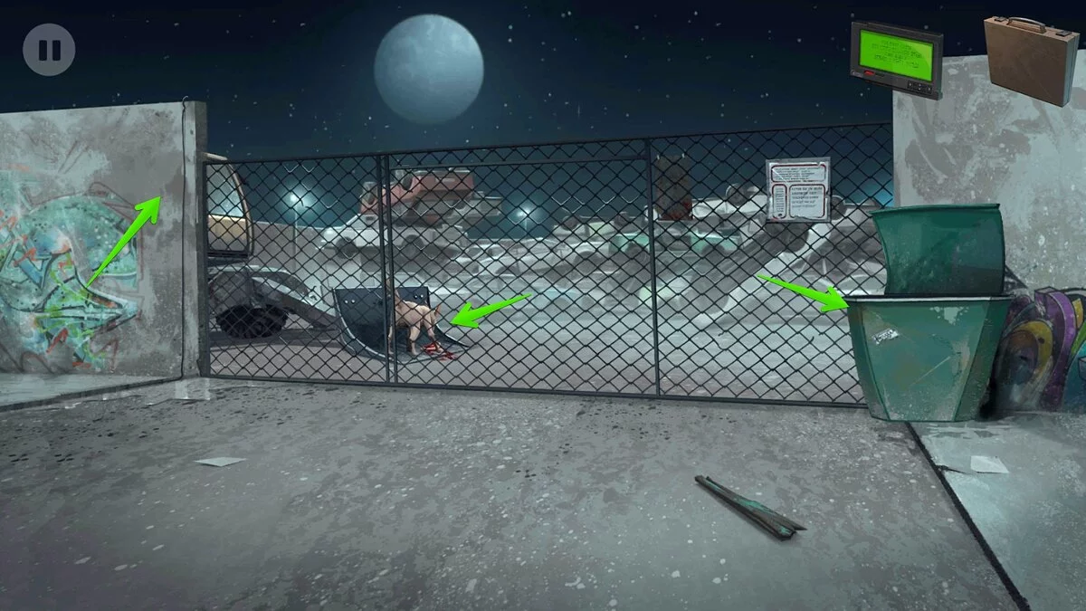 Оказываемся на свалке. В контейнере справа подбираем кабель. Из самого контейнера достаём мясо. Объединяем кабель и крюк, затем применяем их на стене слева. Отдаём мясо собаке, перебираемся через ограду и поднимаем ручку бульдозера.