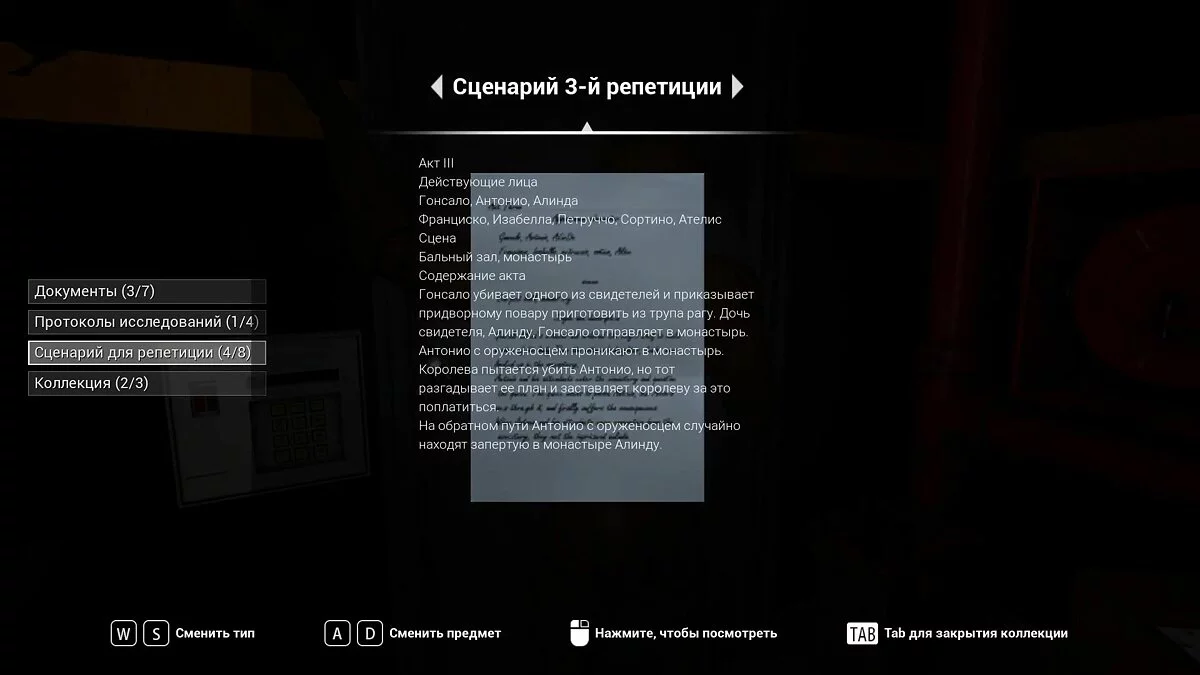 У стоящего возле двери манекена находим сценарий 3-й репетиции (4/8). Проходим в открывшуюся комнату и осматриваем проектор.