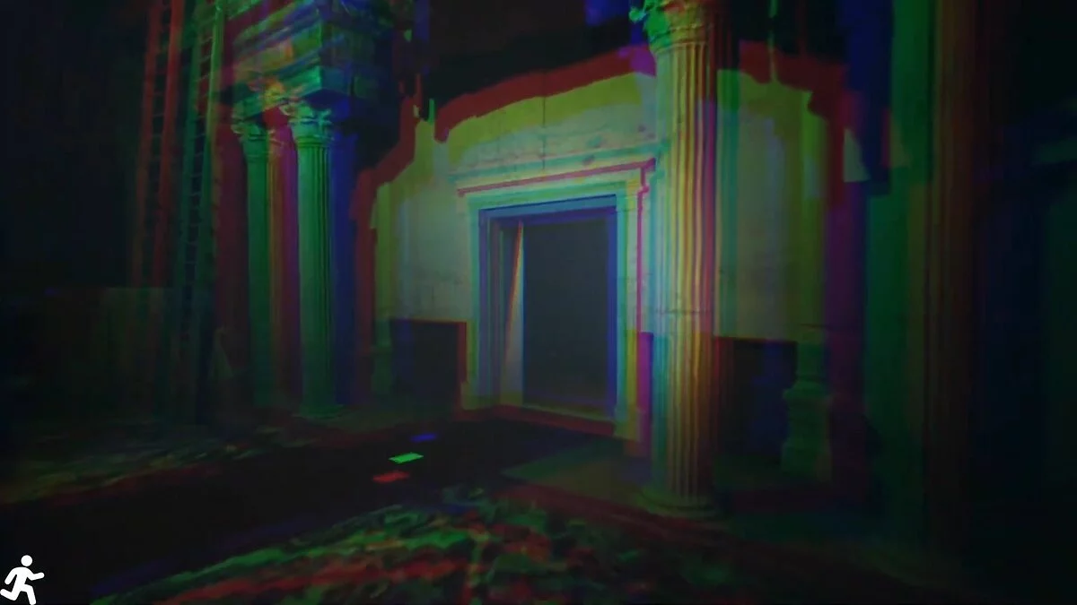 Двигаемся вперёд по узкой тропе. Активируем изображение птичек. Пролетаем между колоннами и не цепляем их. Двигаемся вперёд и проходим через стеклянную дверь. Наблюдаем за силуэтами, пробегаем через открывшиеся ворота и используем лифт.