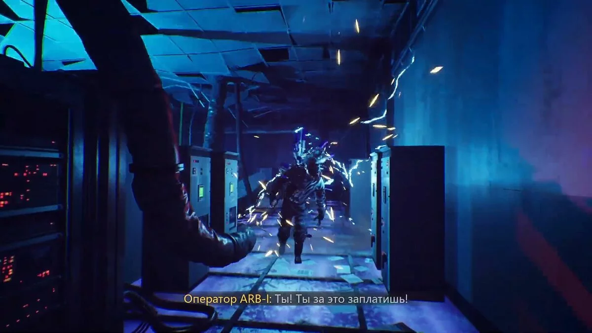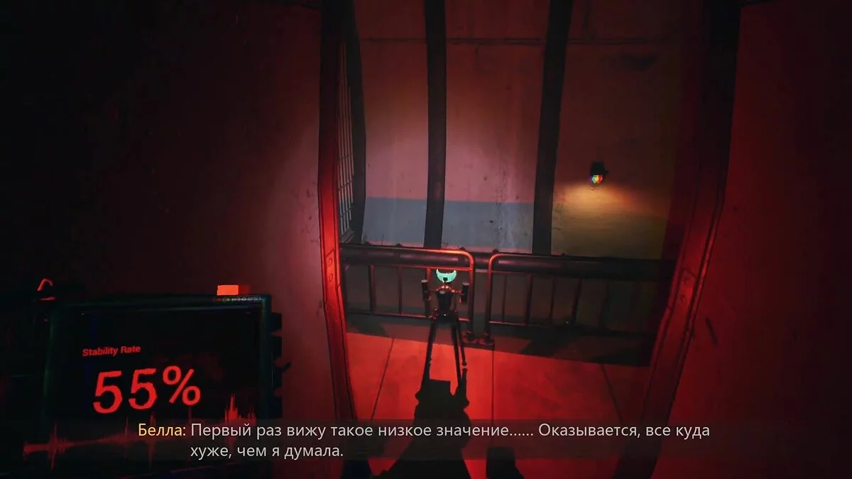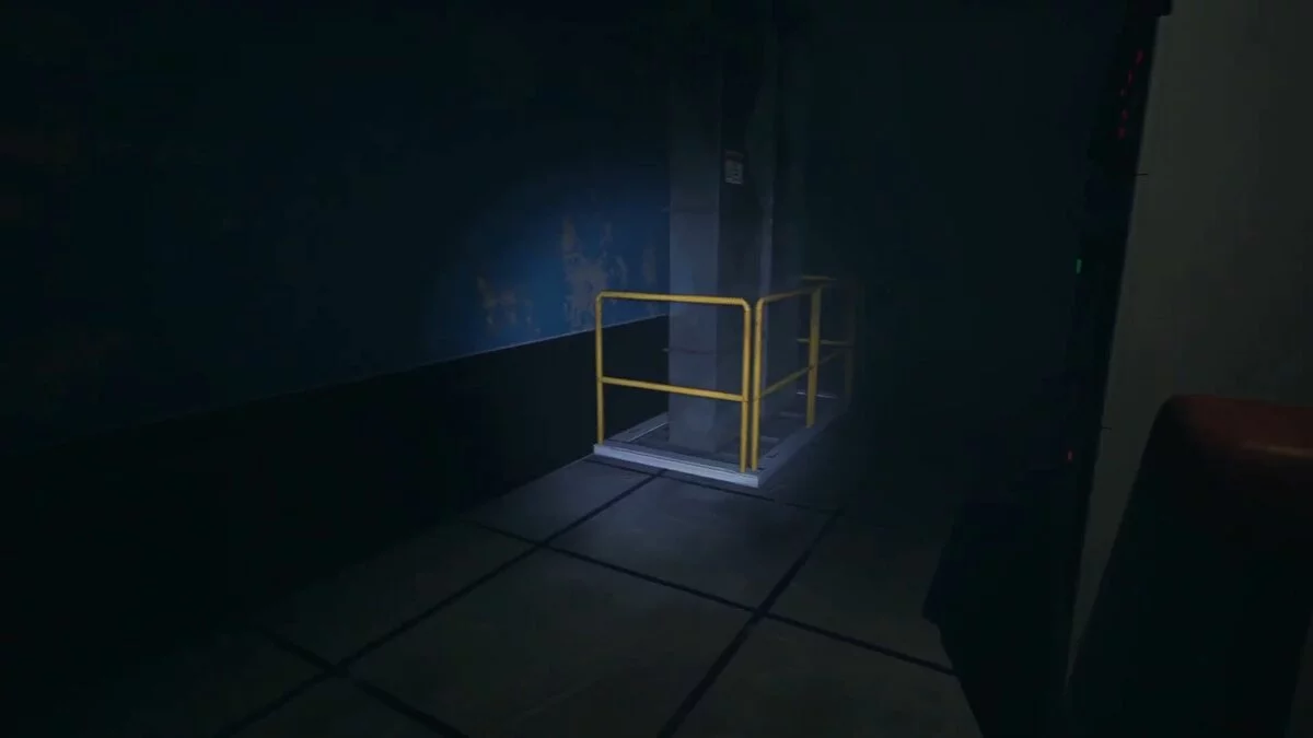 После короткого разговора с мужчиной вернёмся в лифт. Выходим наружу и активируем якорь реальности. Двигаемся по этажу. Замечаем неизвестное существо и сворачиваем в туалет слева.