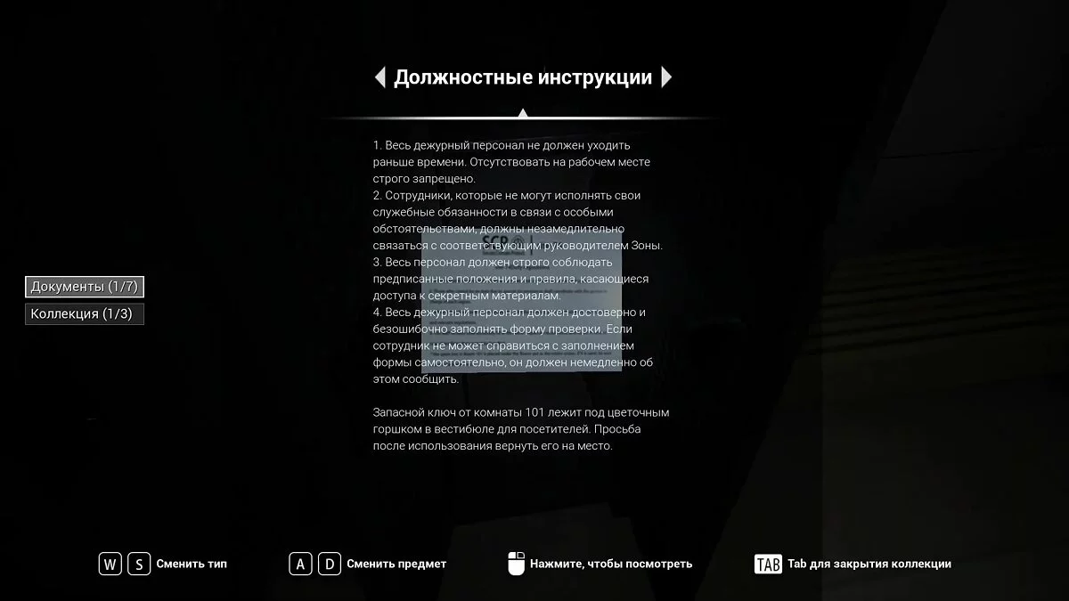 В левом углу помещения забираем ручку от шкафа с документами. Выходим из комнаты обратно и изучаем металлические шкафчики, в одном из которых найдём фрагмент инцидента 1 (документы 4/7). Вставляем ручку и передвигаем шкаф к отверстию с вентиляцией.
