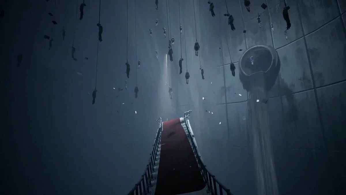 Двигаемся вдоль манекенов и выходим к мосту с подвешенными куклами. Идём вперёд и оказываемся рядом с большим количеством манекенов.