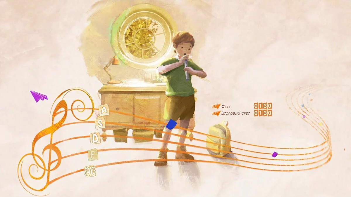 Используем «E», чтобы начать играть мелодию. Применяем клавиши «A», «S», «D», «F» и «Space» и вовремя нажимаем на пролетающие разноцветные листочки. Ошибки ни на что не повлияют, поэтому играем мелодию до конца. Сработает мышеловка. Переходим к управлению мальчиком.