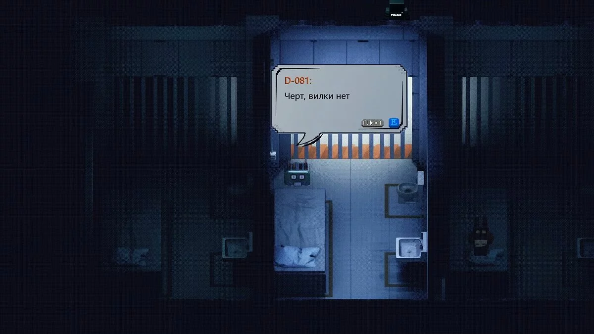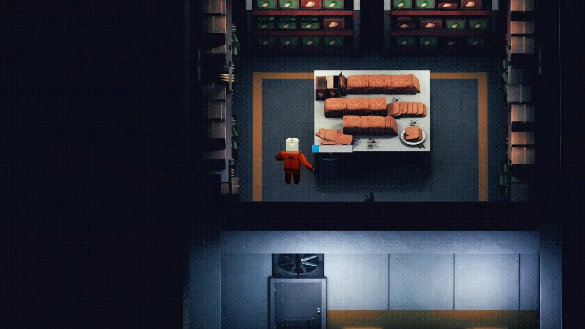 Осматриваем решётку и оказываемся в столовой. Съедаем весь хлеб со столов и из мусорки.