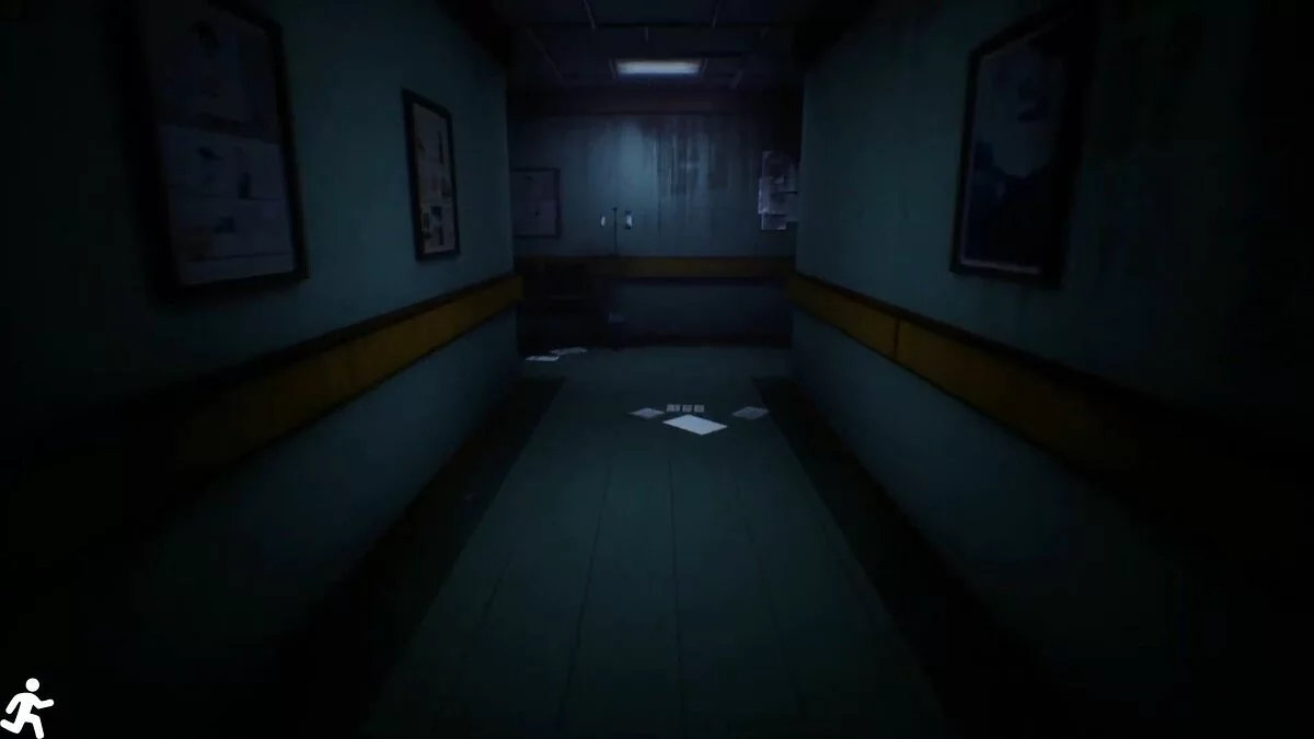 По пути в другой угол комнаты забираем табличку со стула (1/8) и документ (2/8). Убегаем от противника по узким коридорам. На развилках последовательно сворачиваем налево, направо и налево. В качестве подсказки используем небольшие зелёные вывески на стенах внизу. Они подскажут правильное направление.