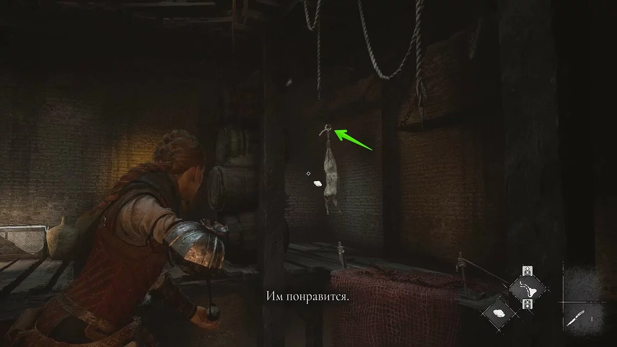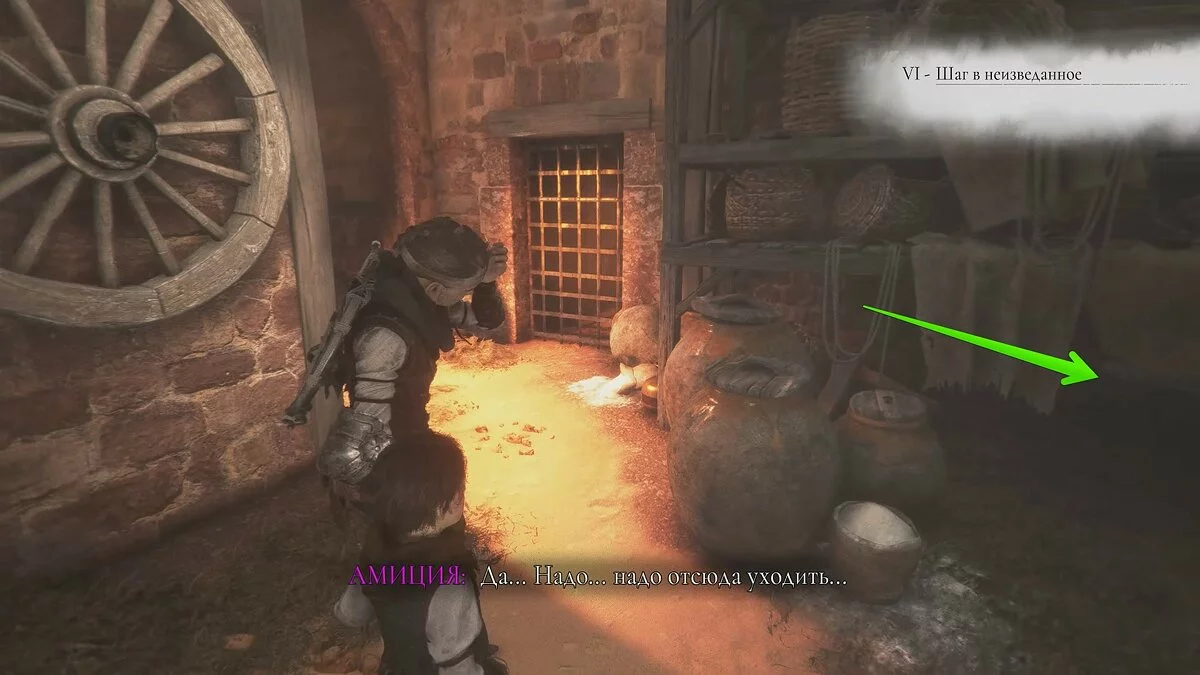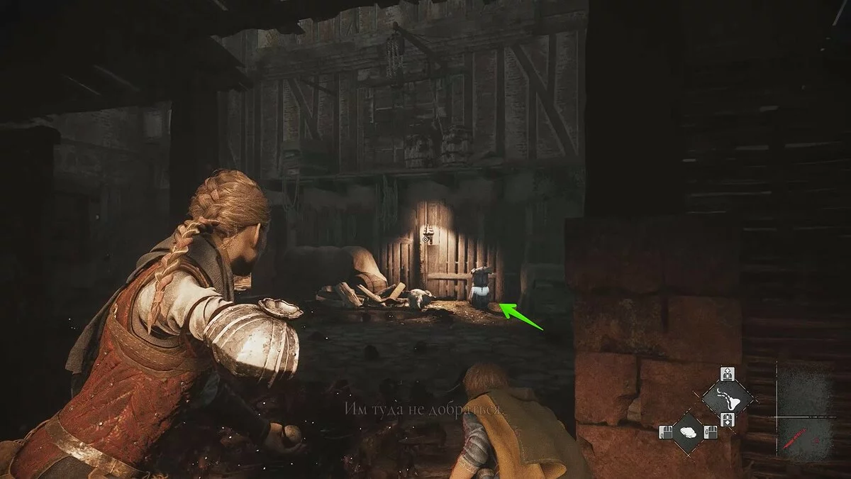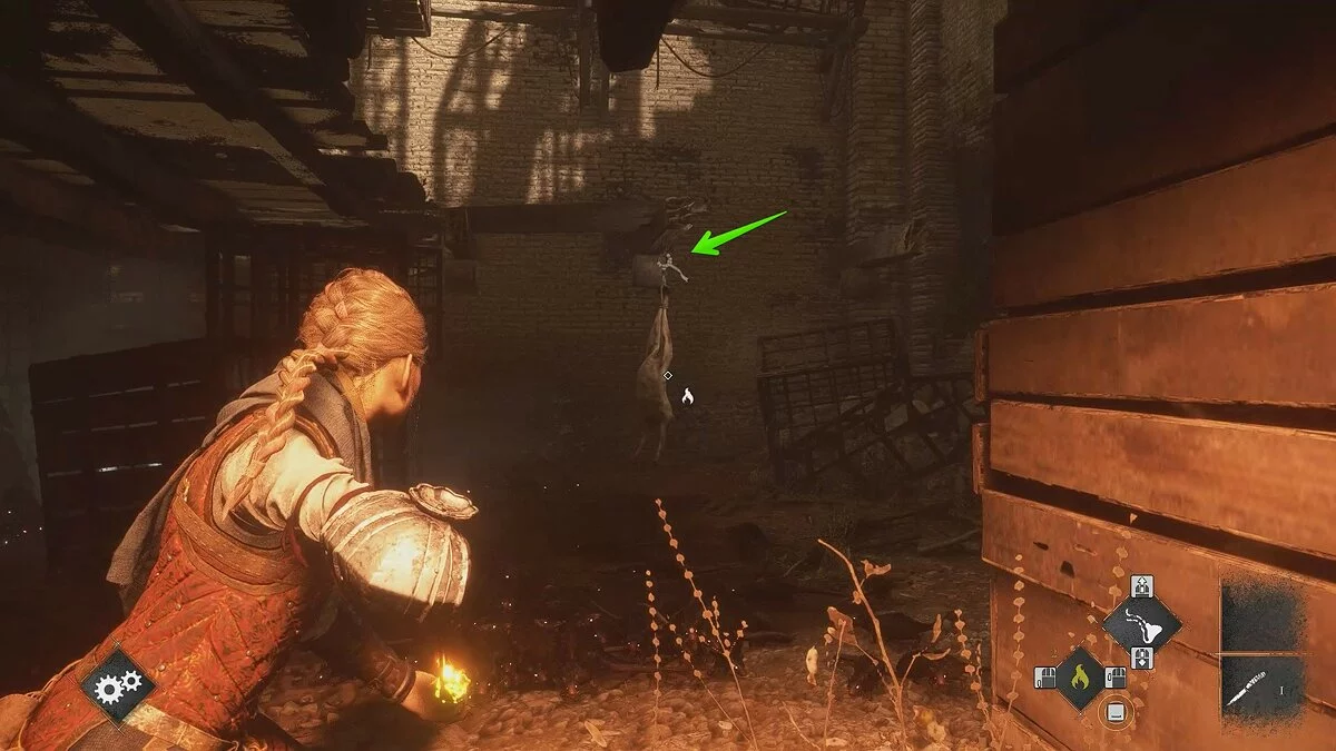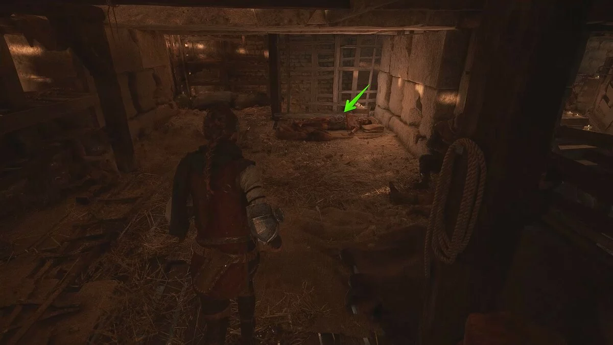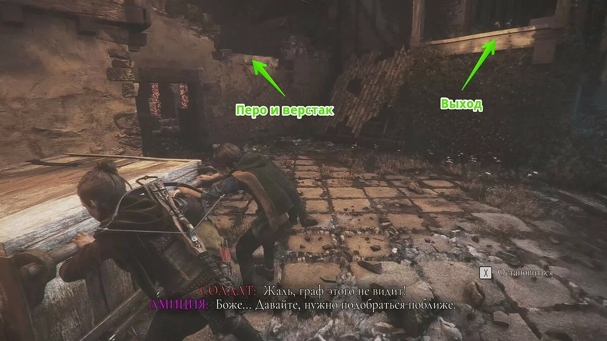 Оказавшись на складе, спуститесь вниз и бегите в левый дальний угол здания. Здесь лежит праща и рюкзак Амиции. Напротив них вы найдёте верстак. Чтобы взаимодействовать с ним, придётся потратить нож.