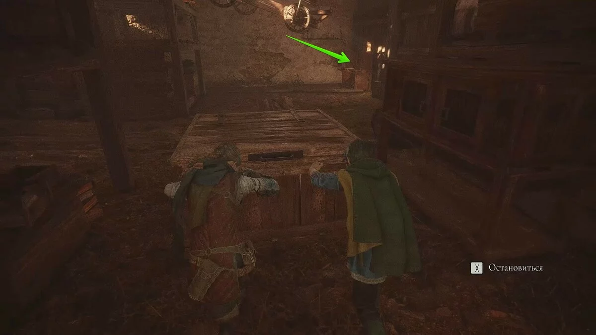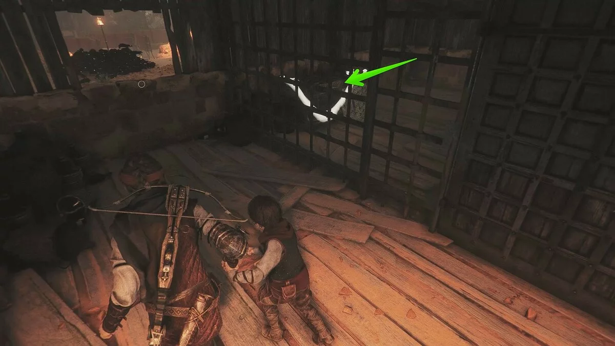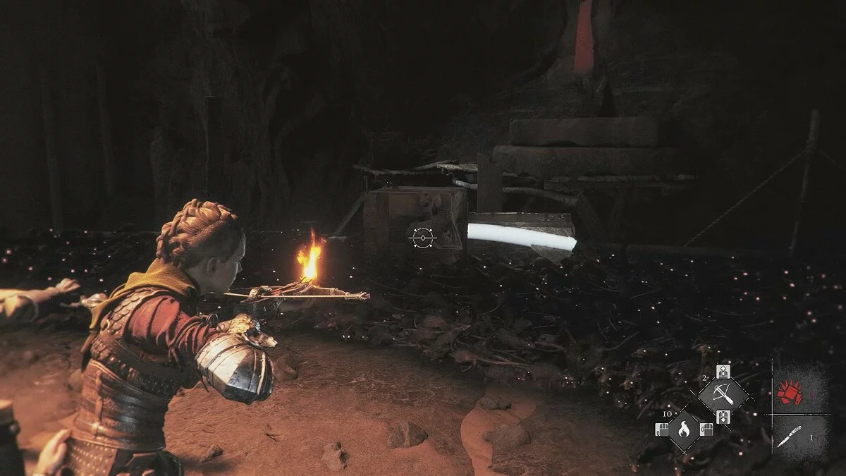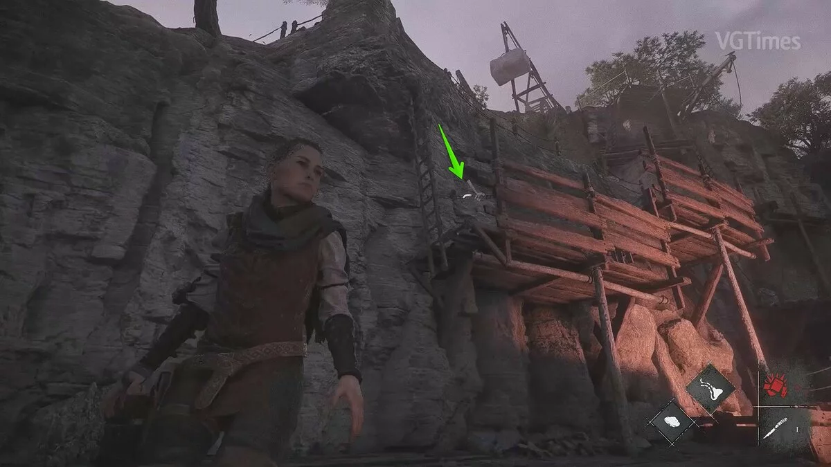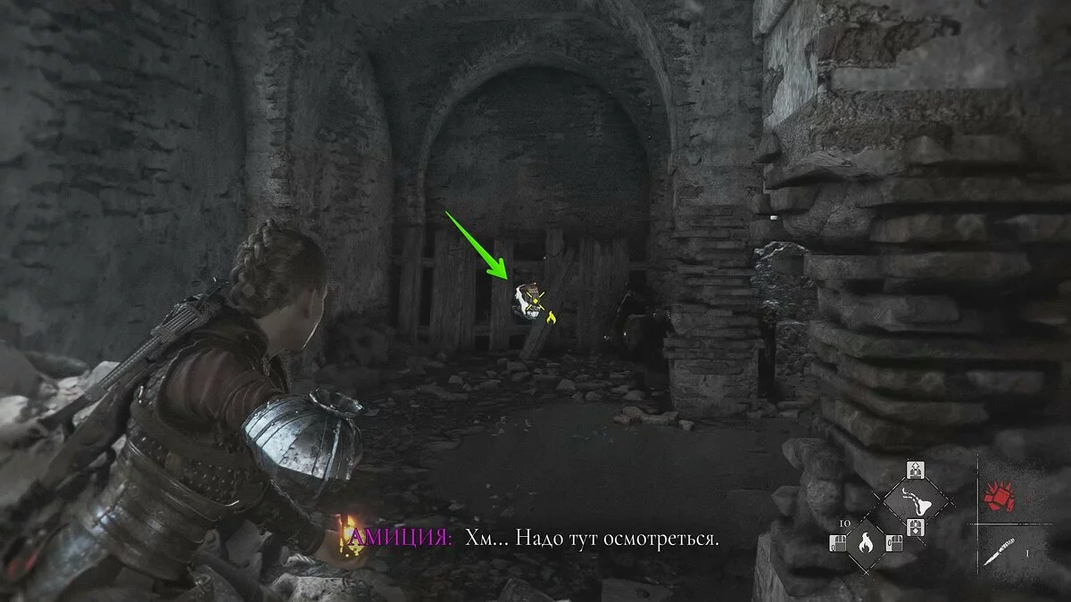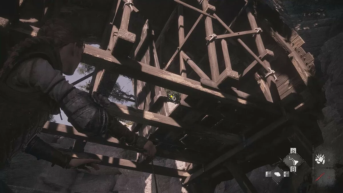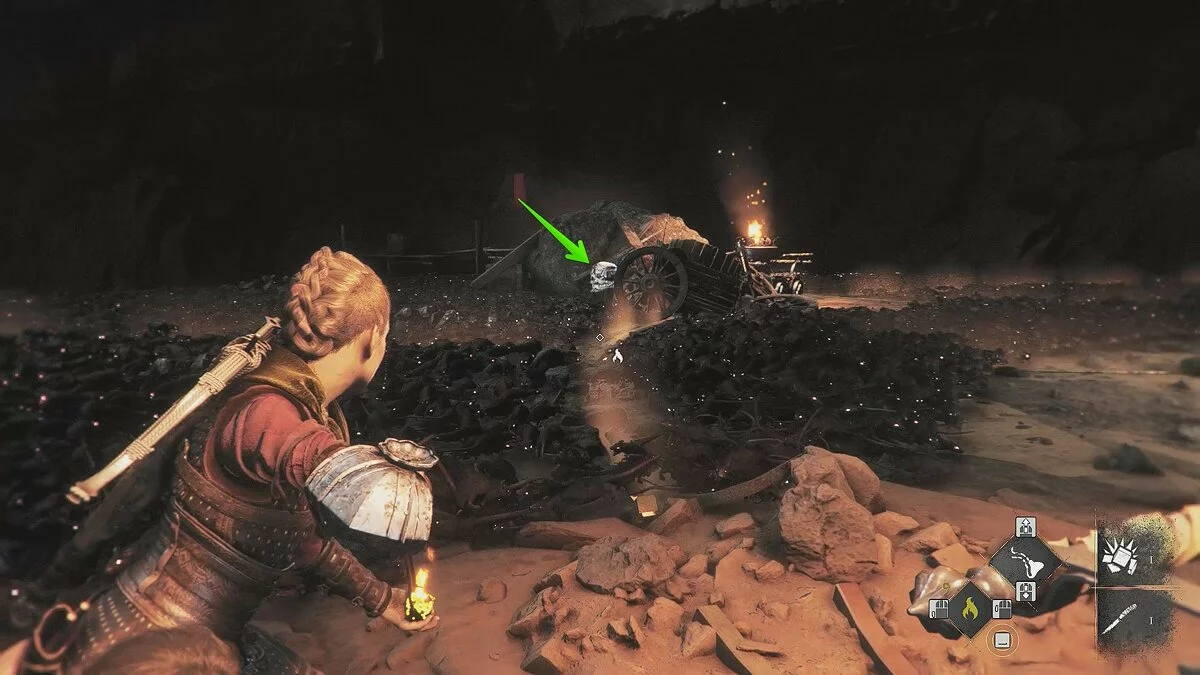 Оказавшись на складе, спуститесь вниз и бегите в левый дальний угол здания. Здесь лежит праща и рюкзак Амиции. Напротив них вы найдёте верстак. Чтобы взаимодействовать с ним, придётся потратить нож.