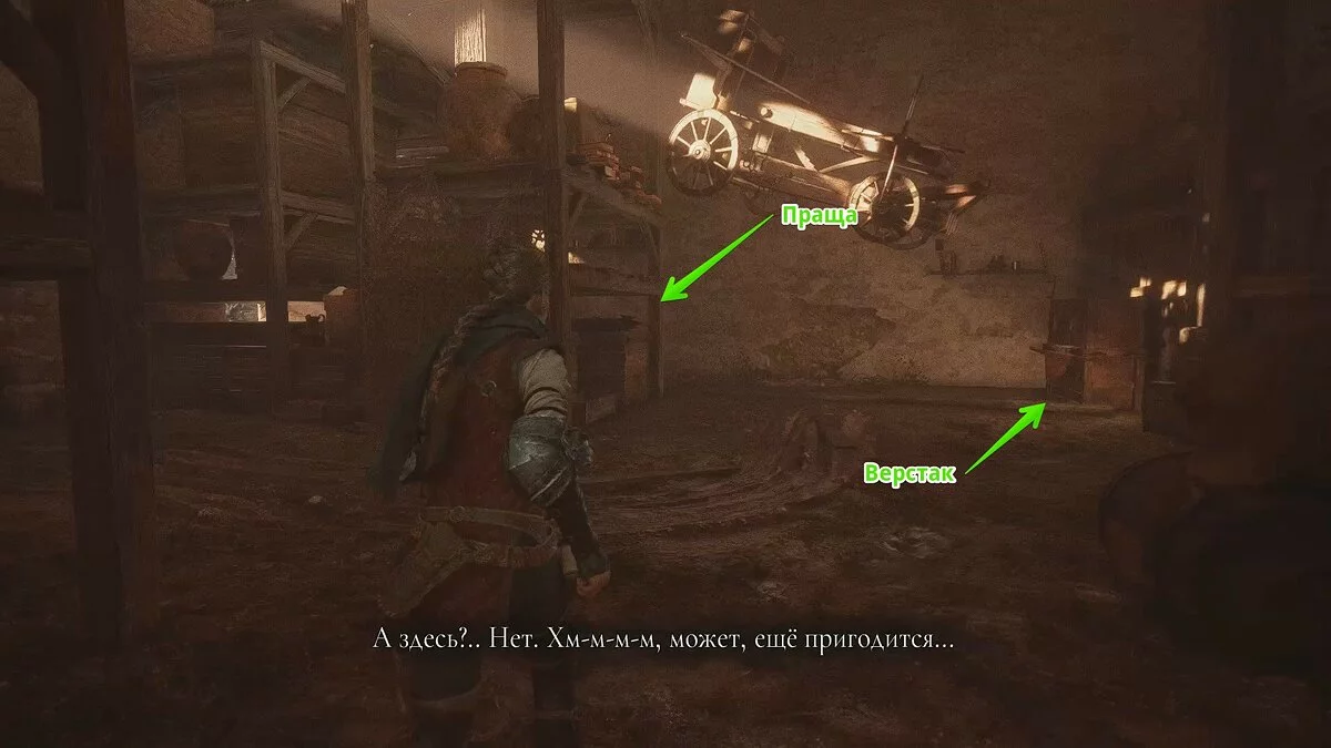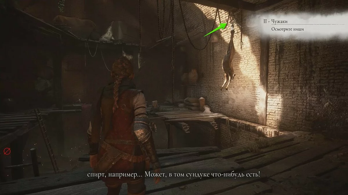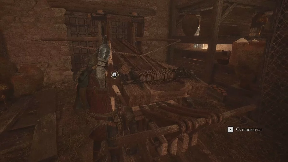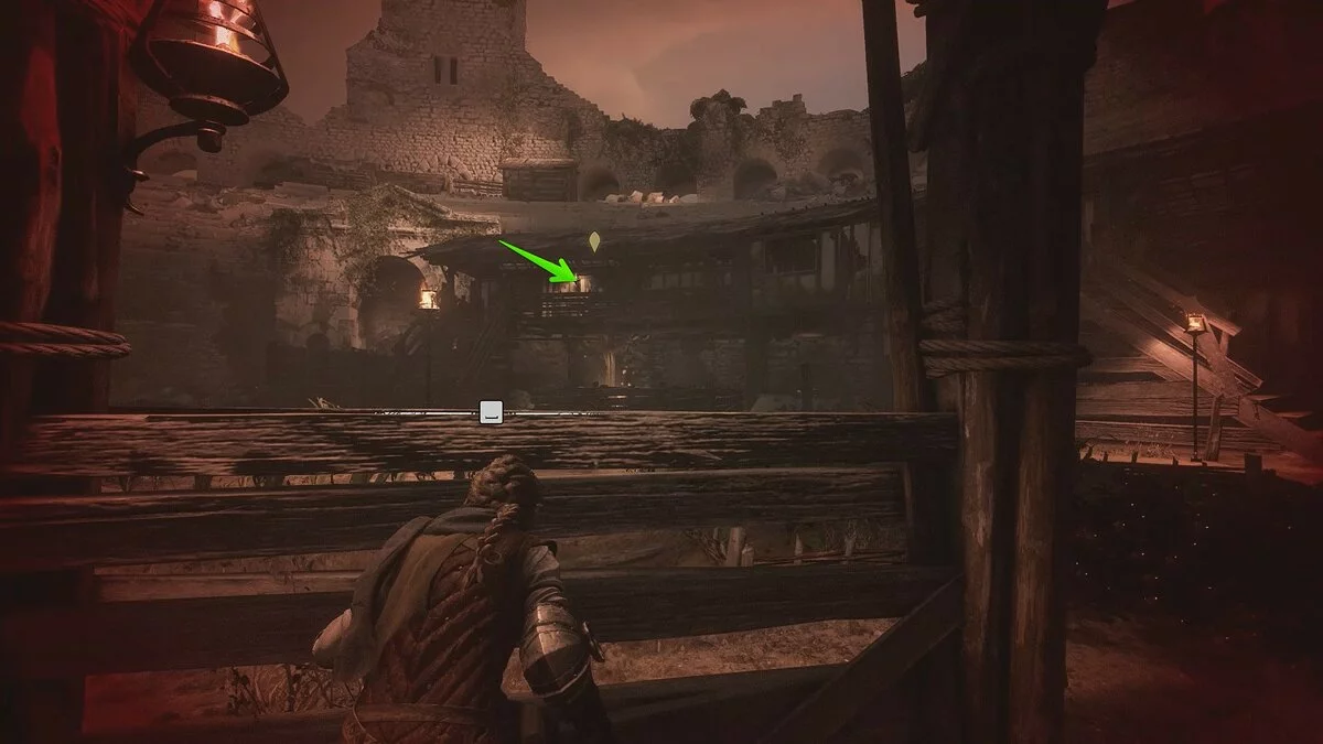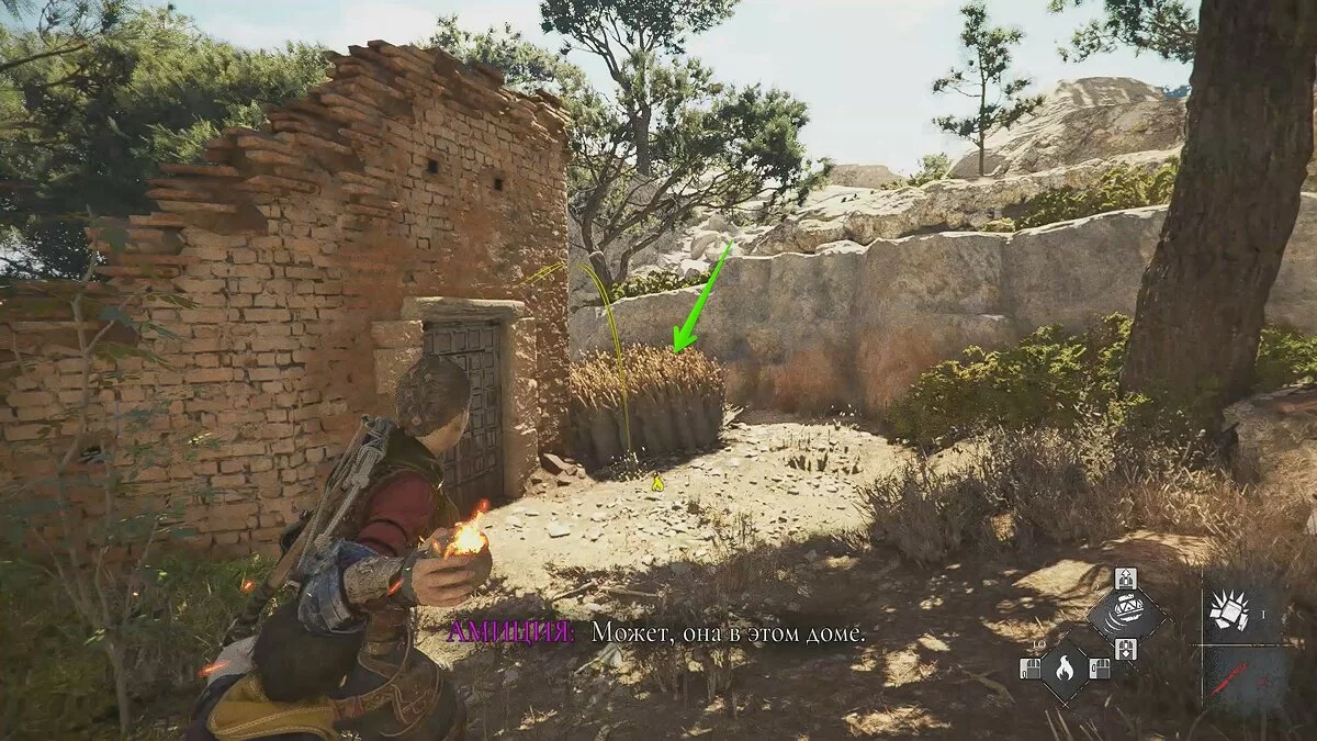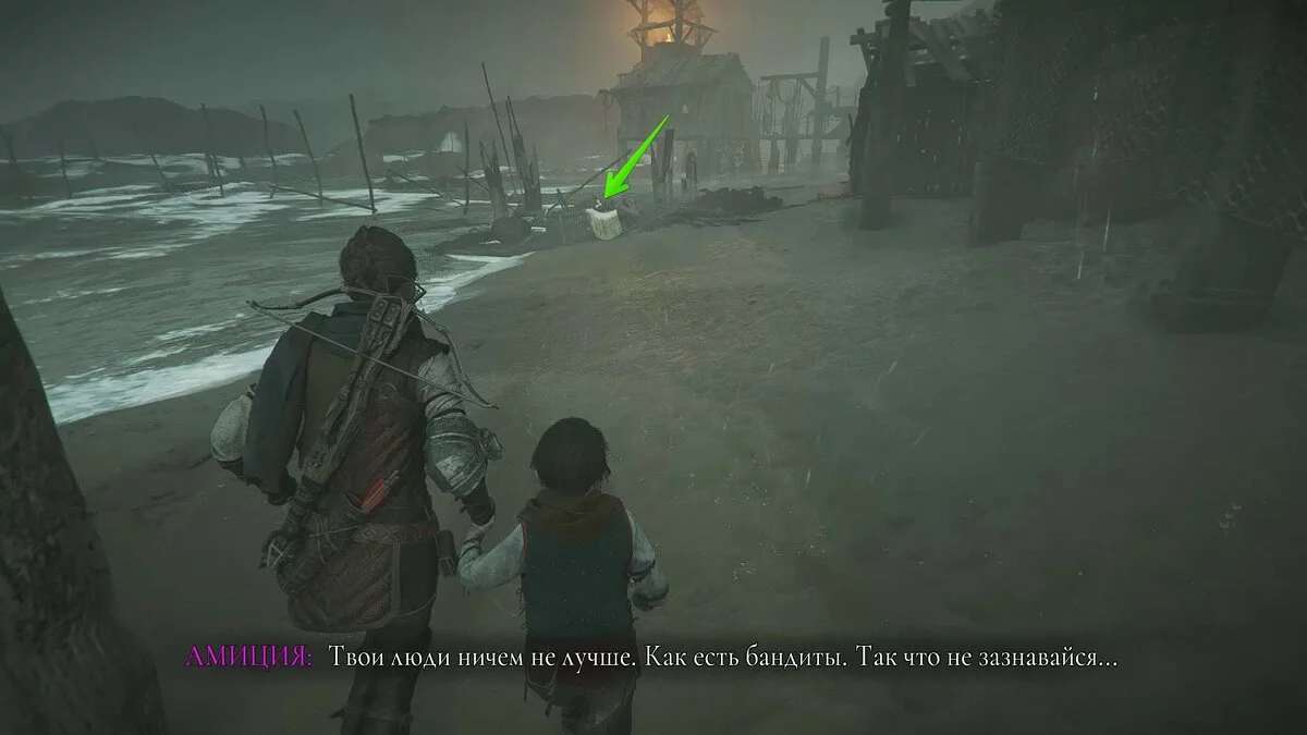 Оказавшись на складе, спуститесь вниз и бегите в левый дальний угол здания. Здесь лежит праща и рюкзак Амиции. Напротив них вы найдёте верстак. Чтобы взаимодействовать с ним, придётся потратить нож.