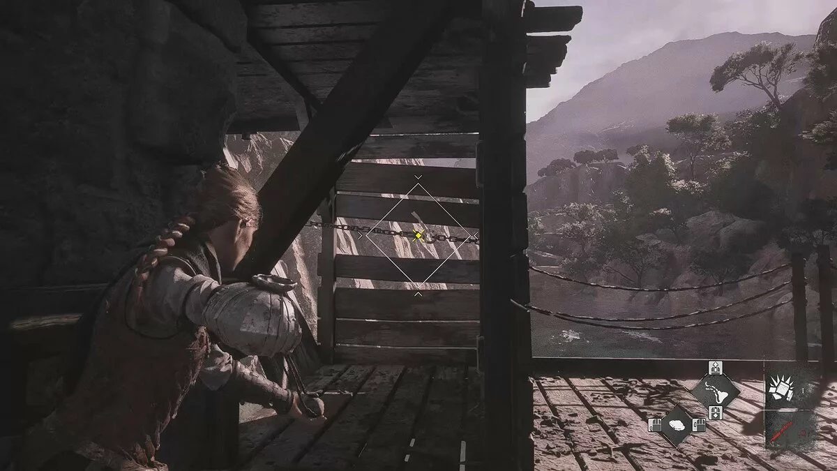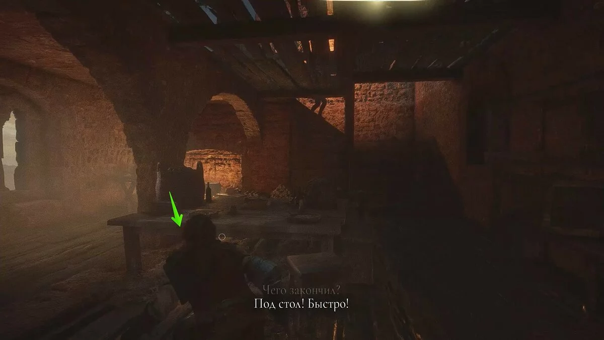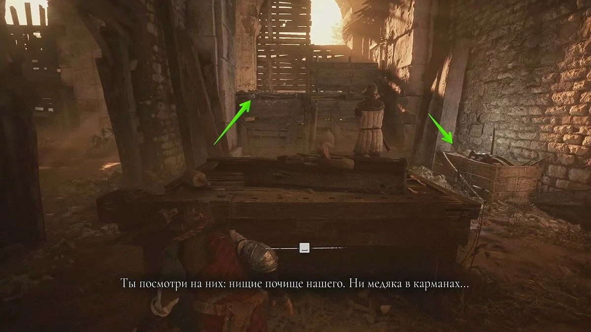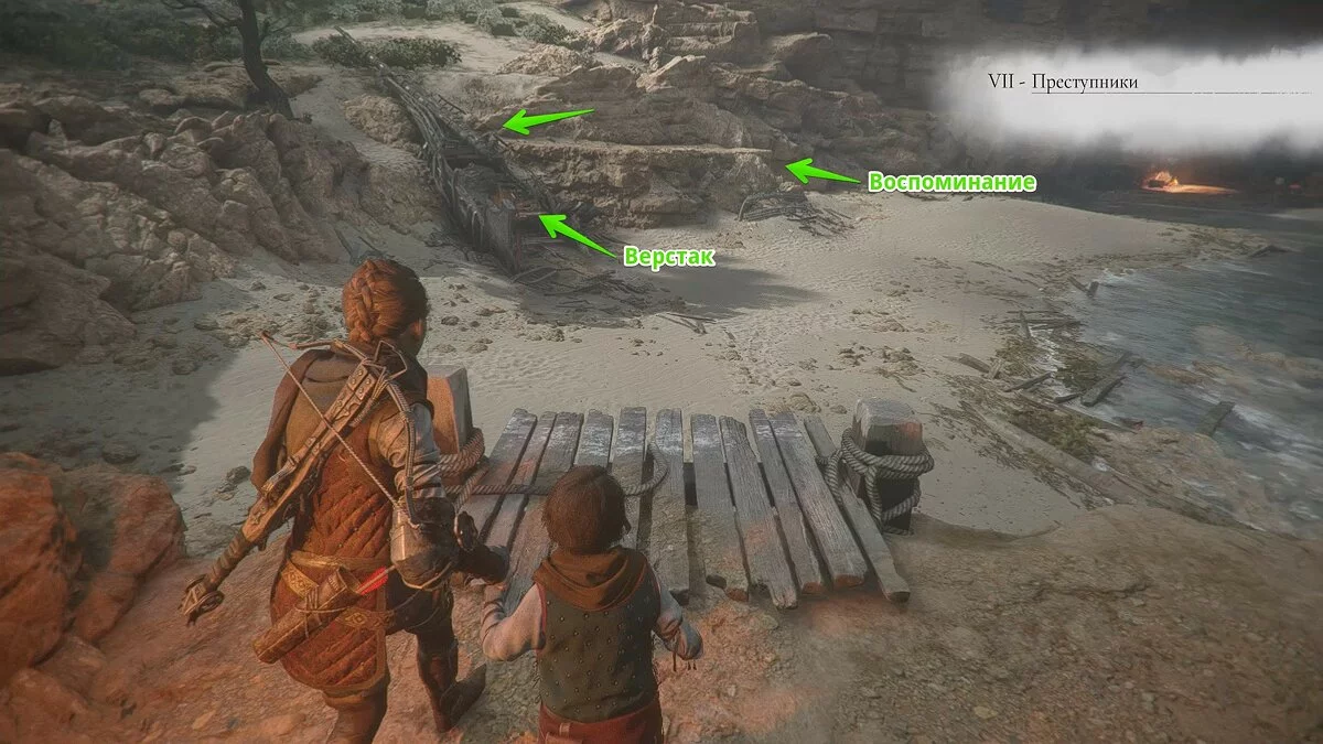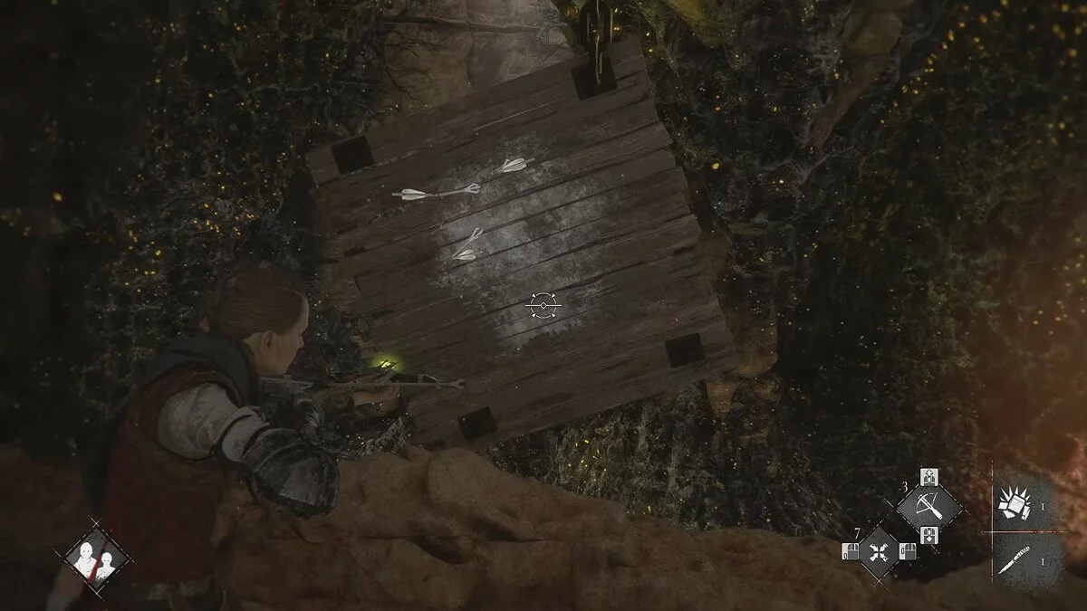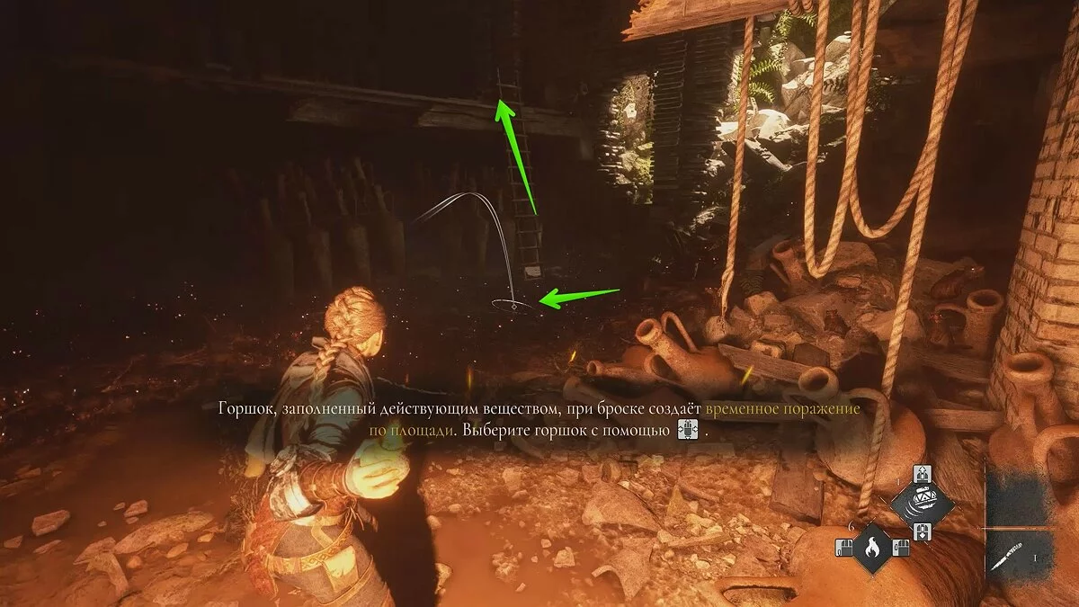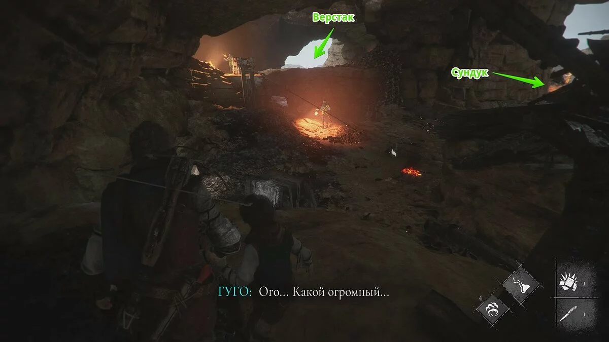 Оказавшись на складе, спуститесь вниз и бегите в левый дальний угол здания. Здесь лежит праща и рюкзак Амиции. Напротив них вы найдёте верстак. Чтобы взаимодействовать с ним, придётся потратить нож.