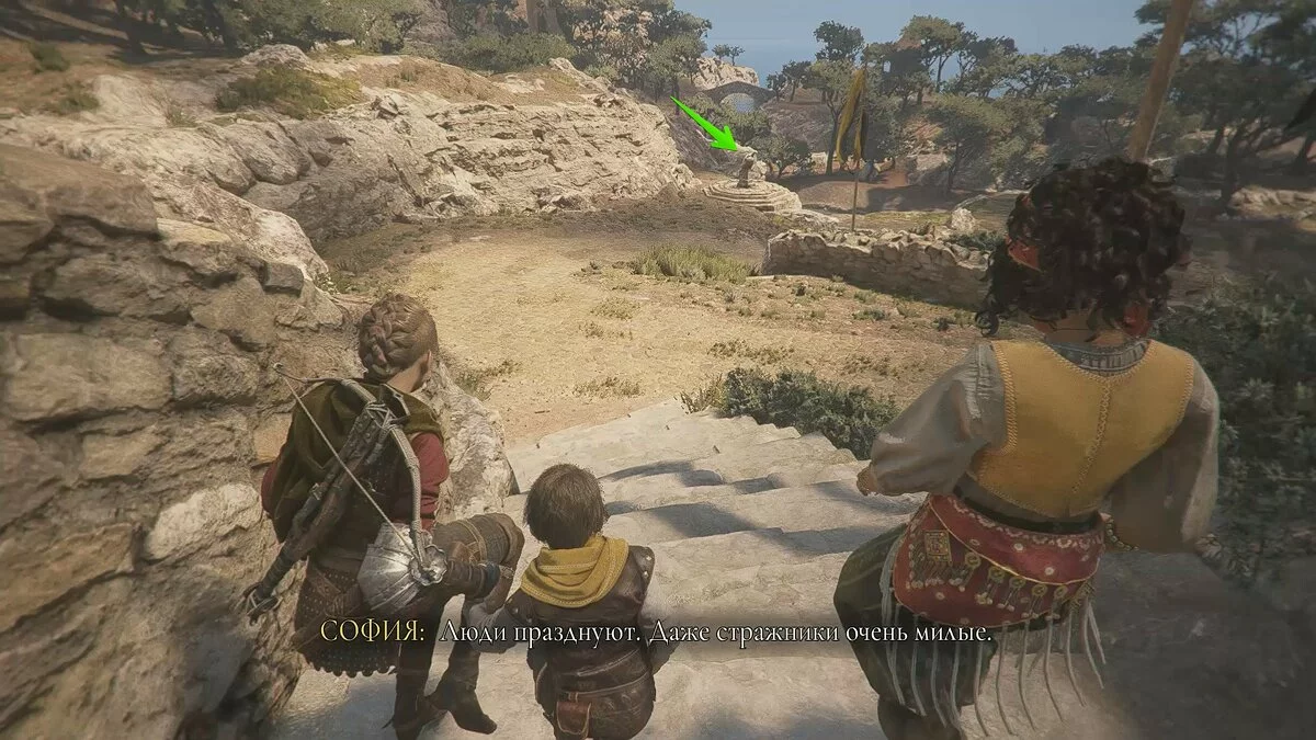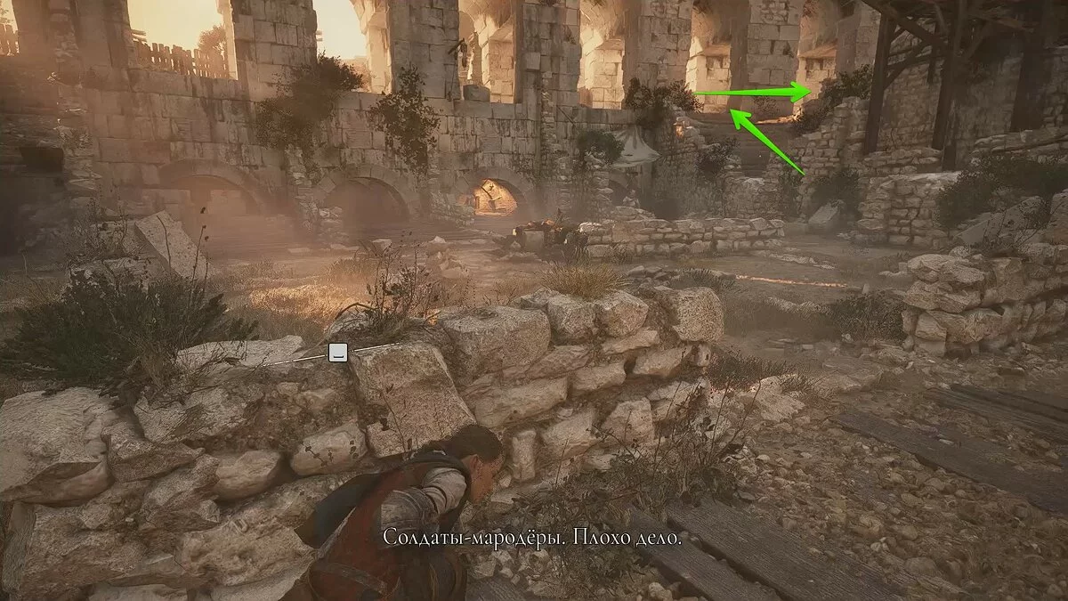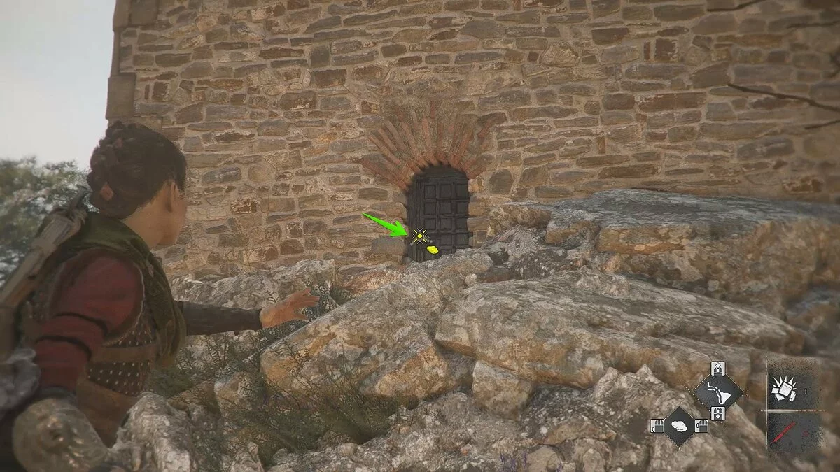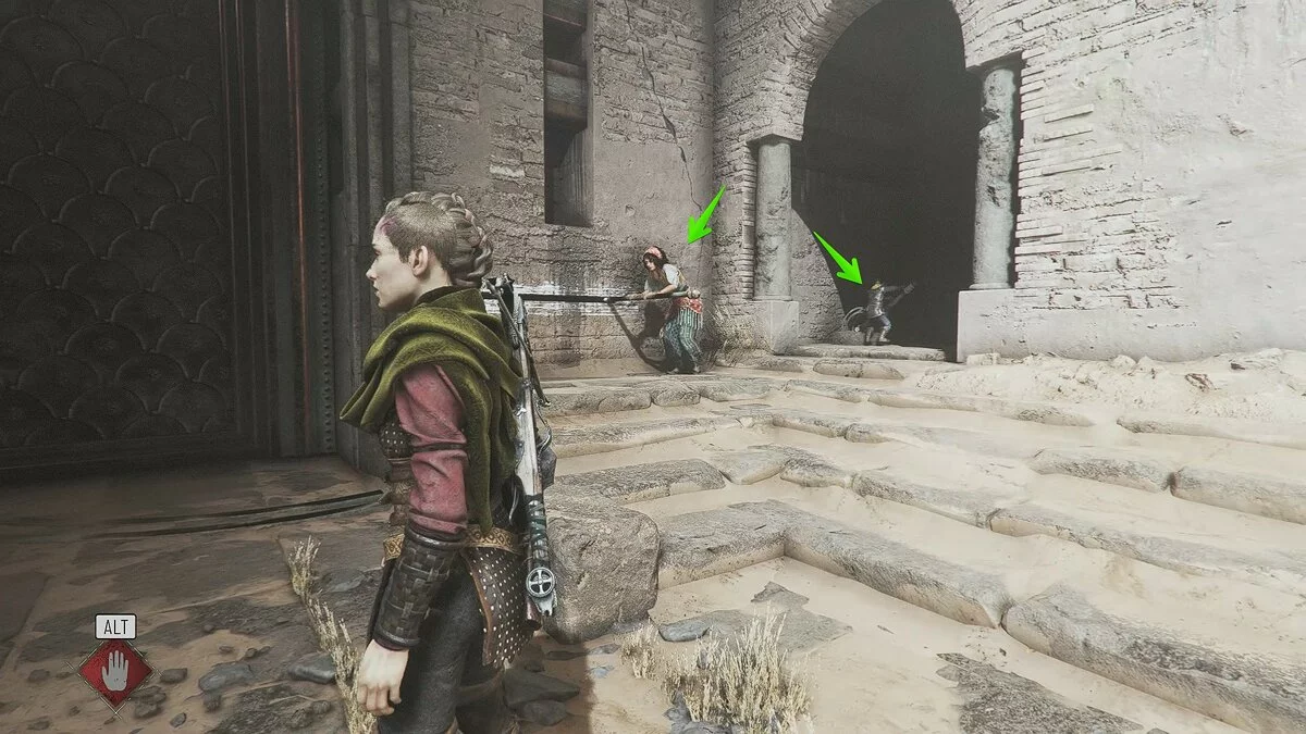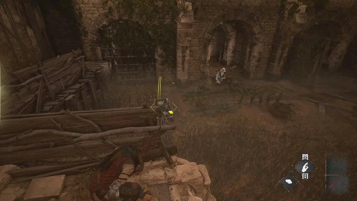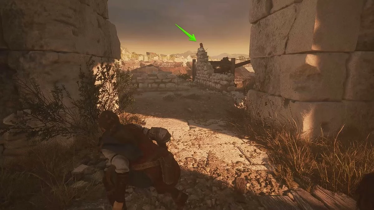 Вскоре вы снова окажетесь на открытой площадке. Помимо обычных наёмников, здесь также будет патрулировать лучник. Избавиться от него довольно просто: поднимитесь по каменной лестнице с левой стороны, отвлеките охранника поблизости и стреляйте по лучнику из пращи.