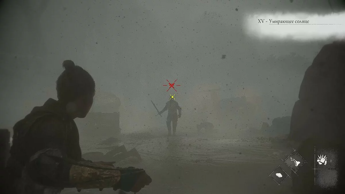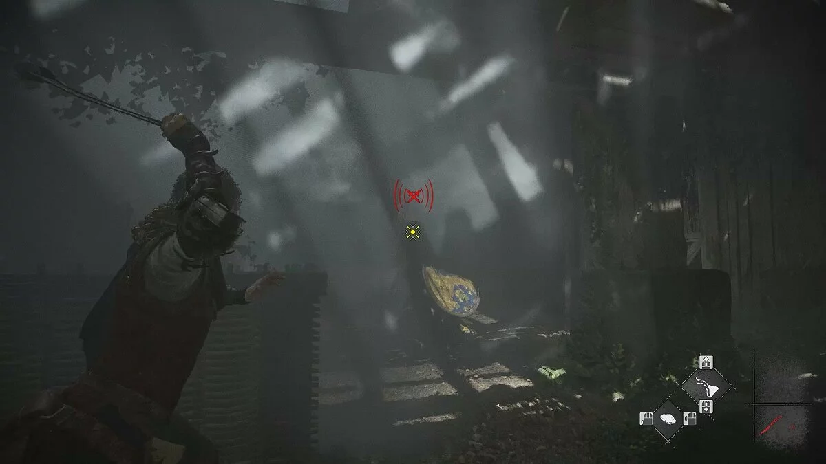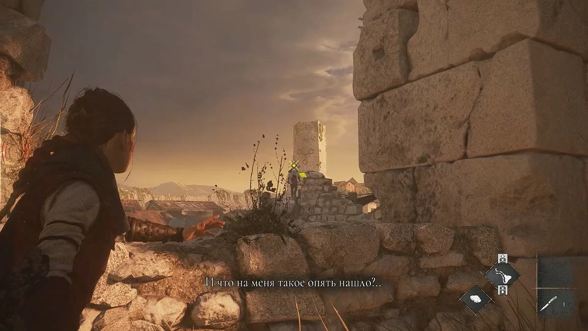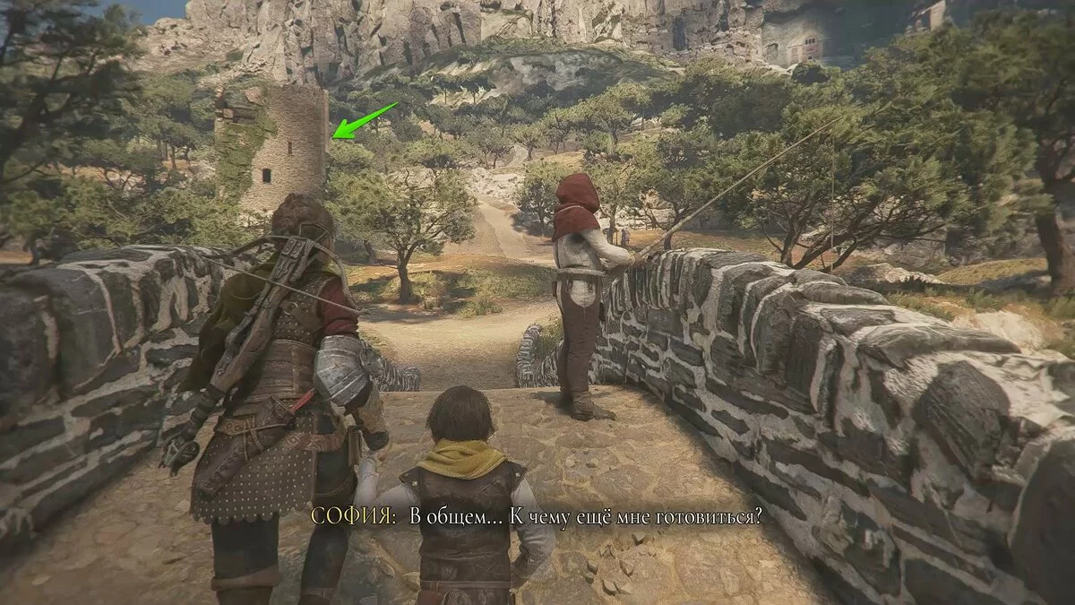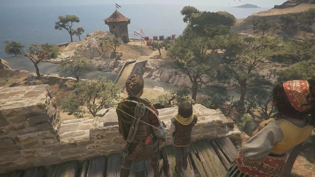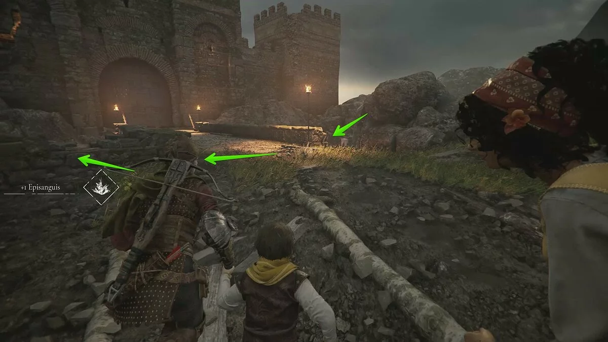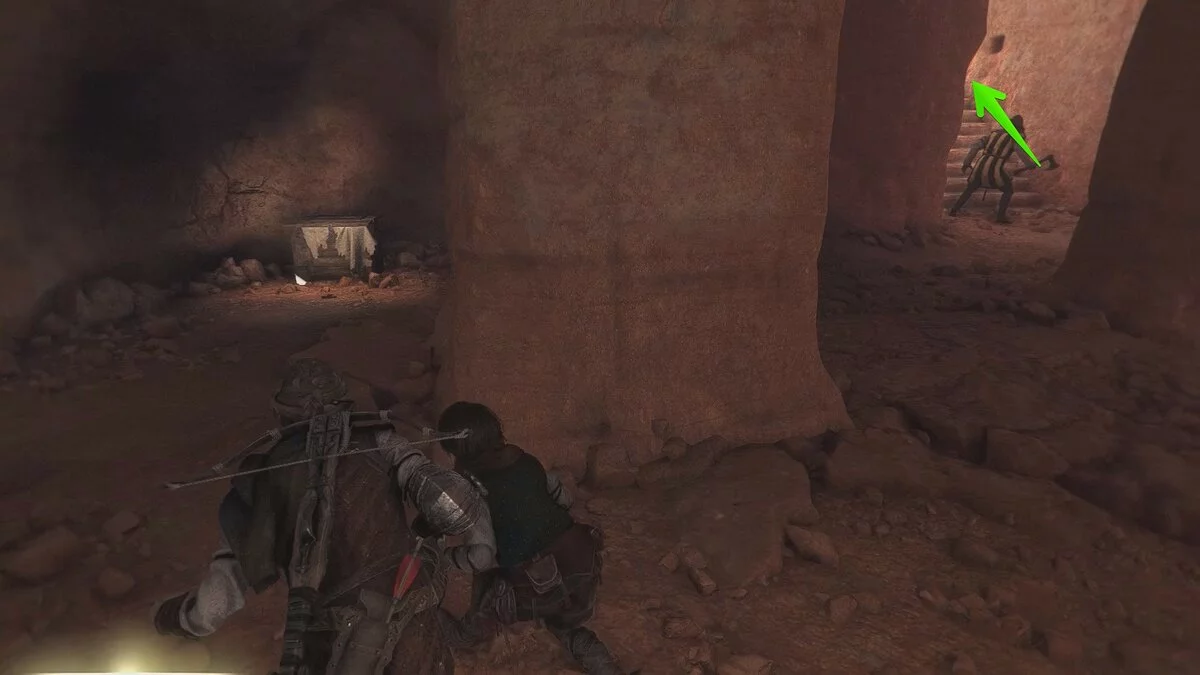 Вскоре вы снова окажетесь на открытой площадке. Помимо обычных наёмников, здесь также будет патрулировать лучник. Избавиться от него довольно просто: поднимитесь по каменной лестнице с левой стороны, отвлеките охранника поблизости и стреляйте по лучнику из пращи.