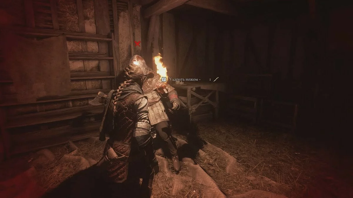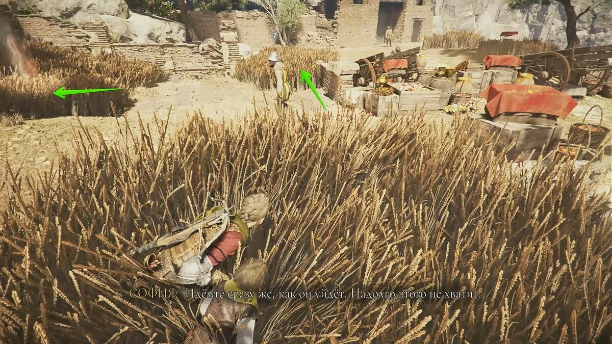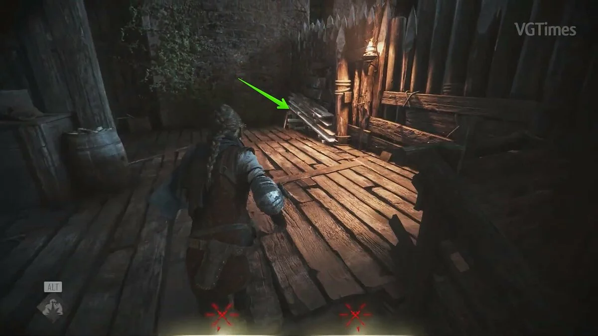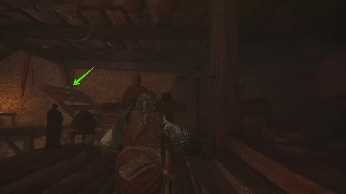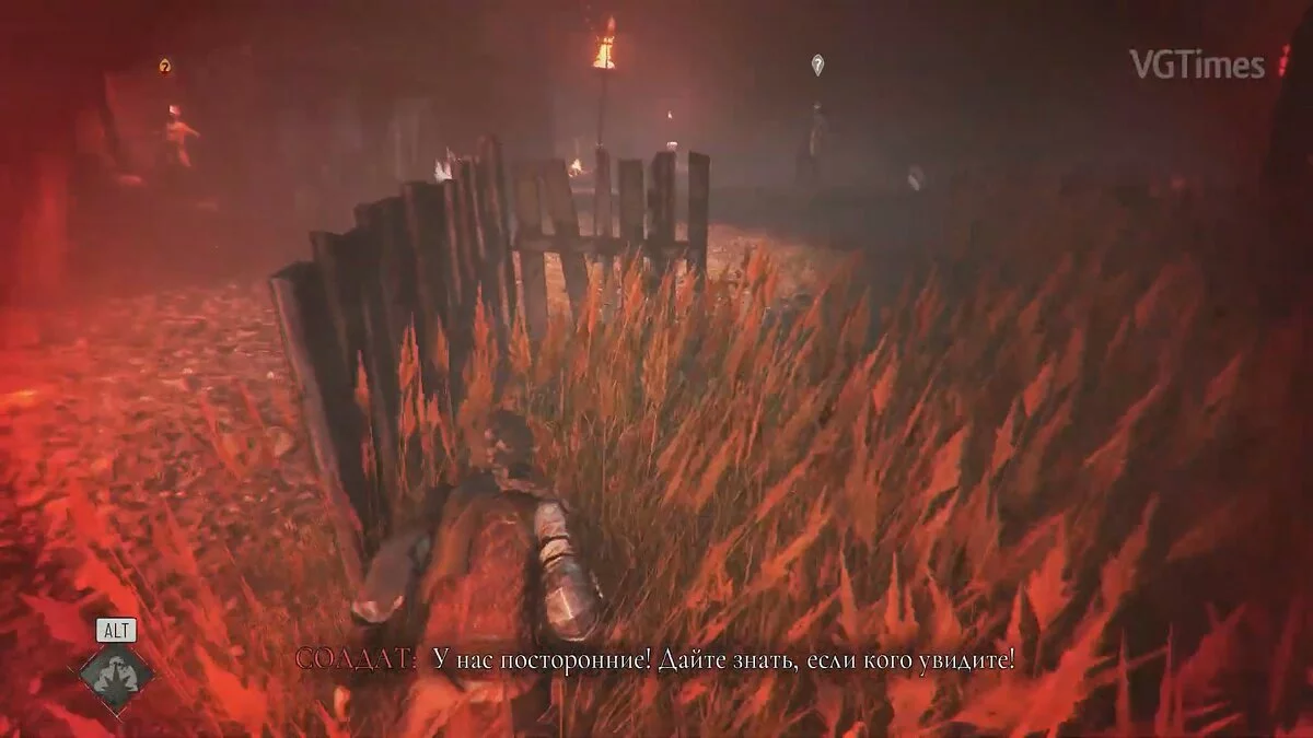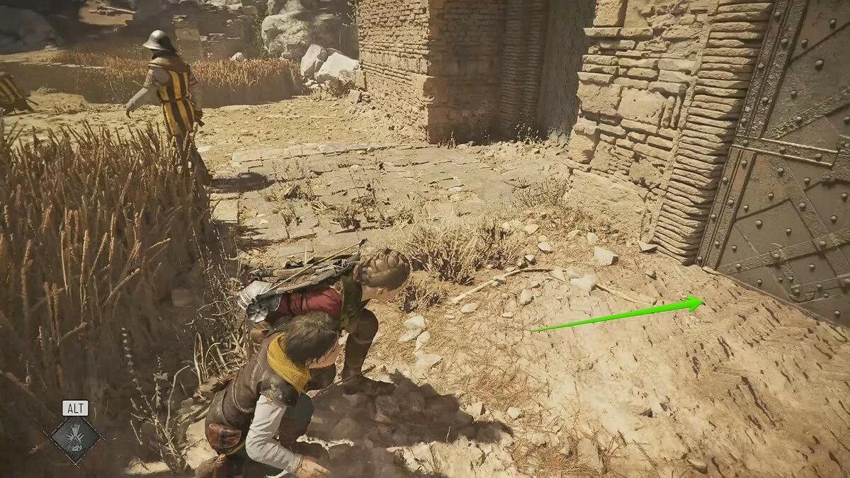 Следуйте в дальнюю левую часть локации. Подождите, пока стражник в шлеме отойдёт подальше и избавьтесь от двух врагов. На их крики может прибежать ещё один обычный противник — пусть он разделит их участь.