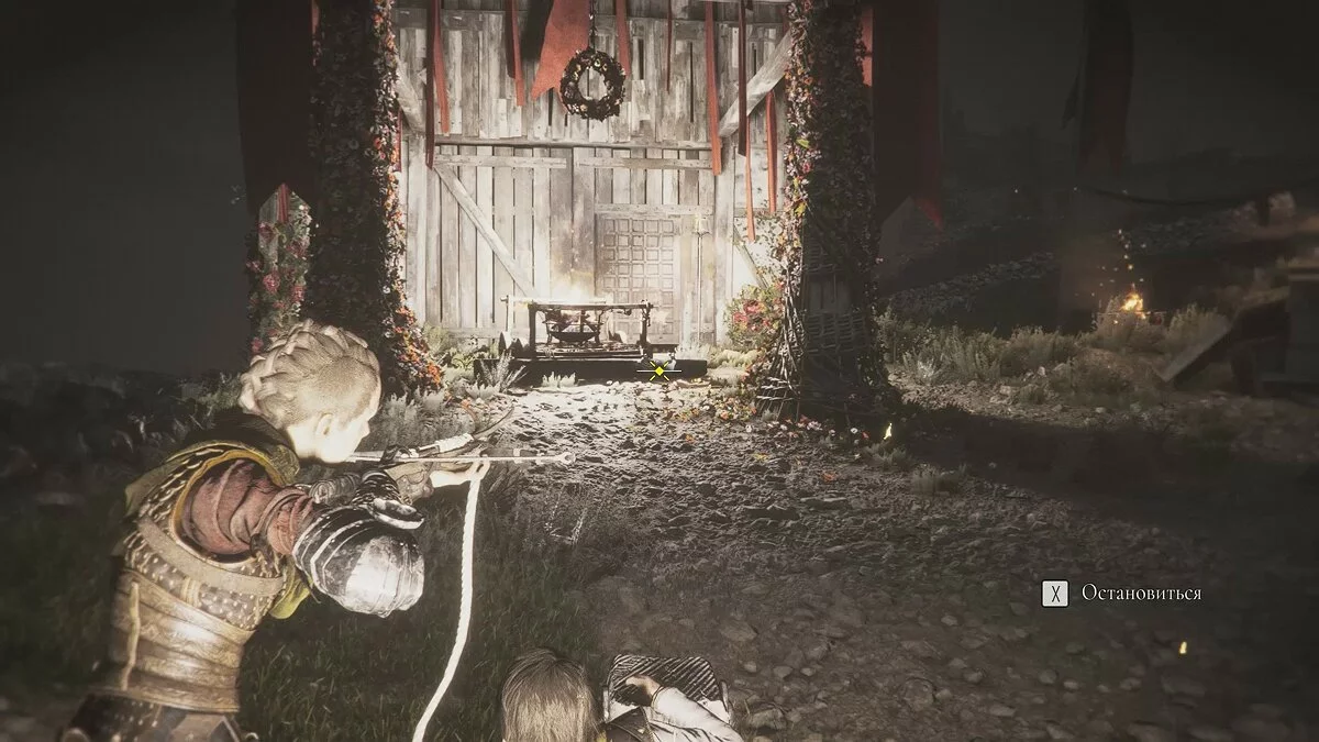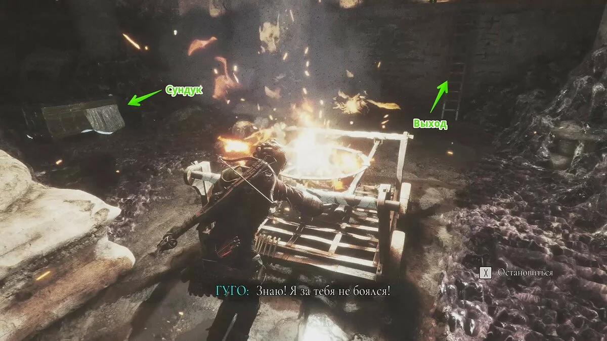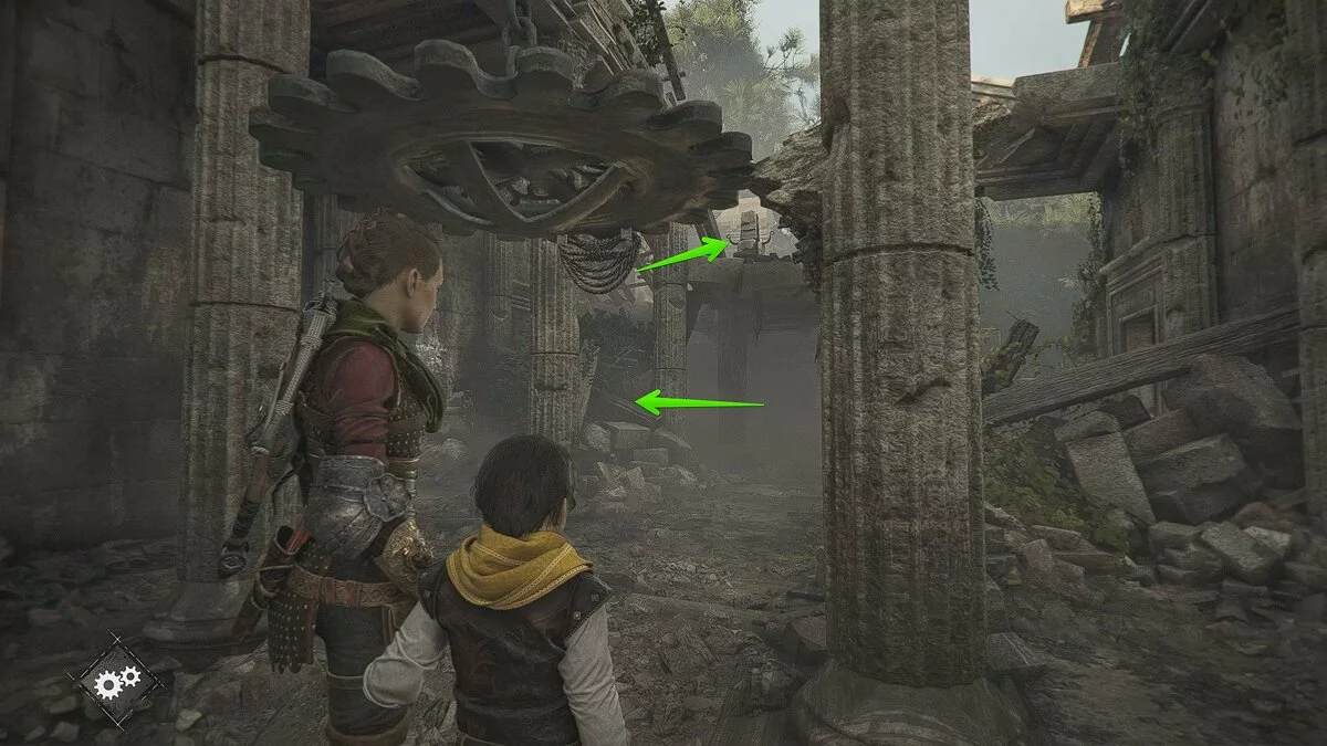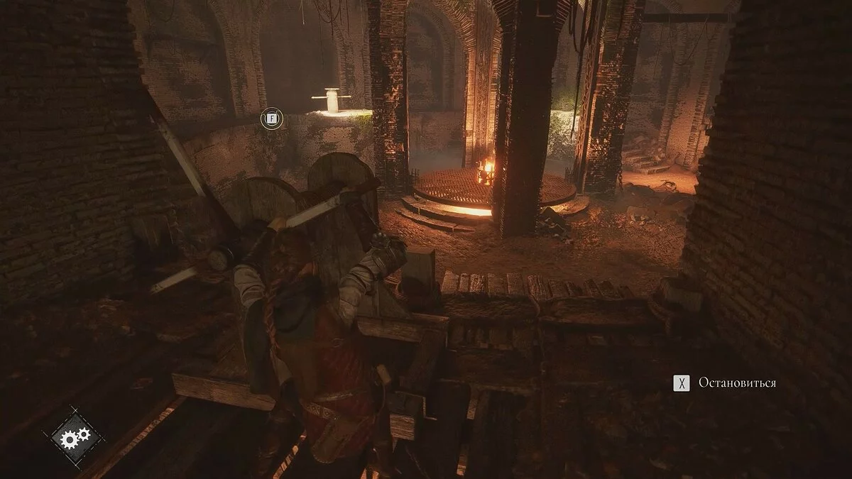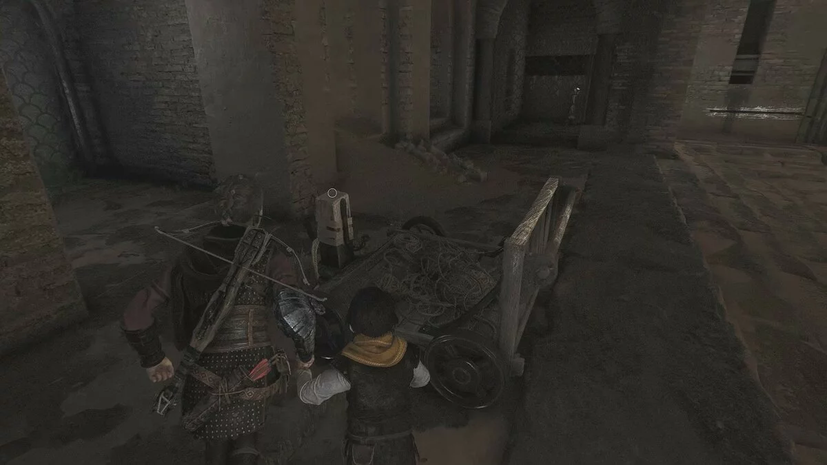 Подойдите к небольшому ящику, чтобы Лука взаимодействовал с ним. Передвиньте телегу и прикажите спутнику активировать рычаг. Стреляйте по кольцу и сдвиньте баллисту к воротам. После кат-сцены глава будет завершена.