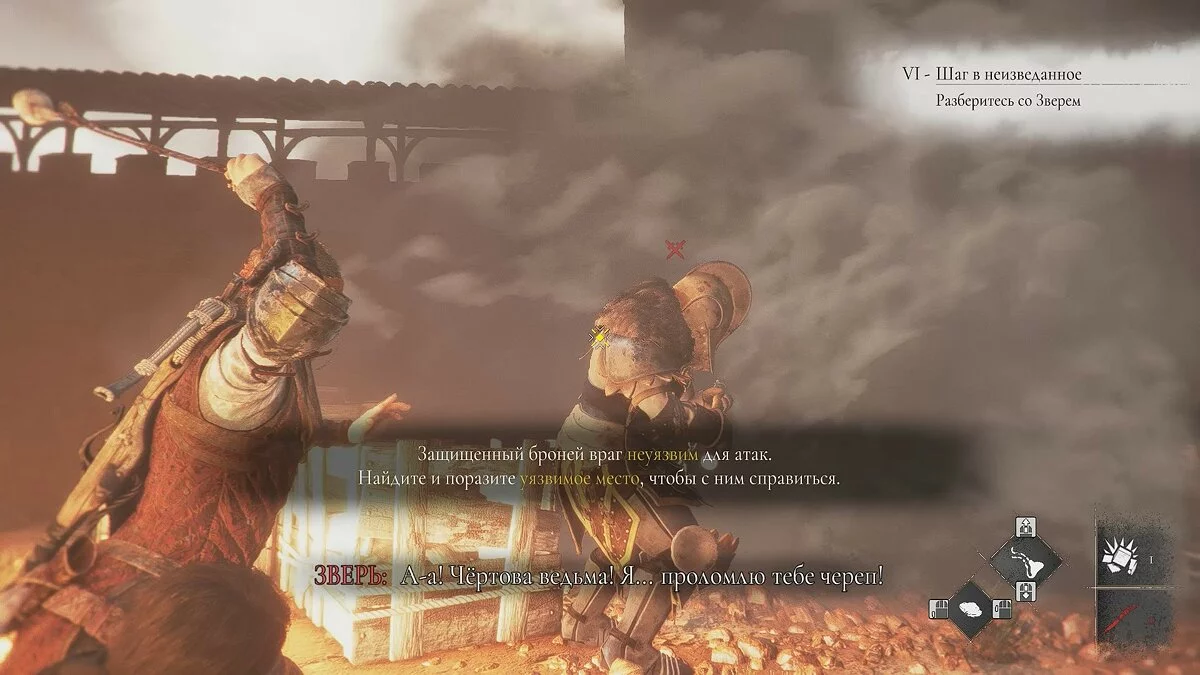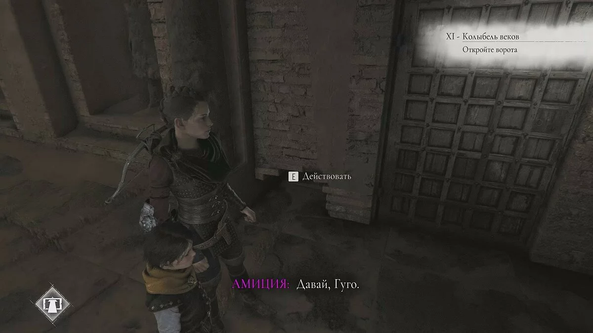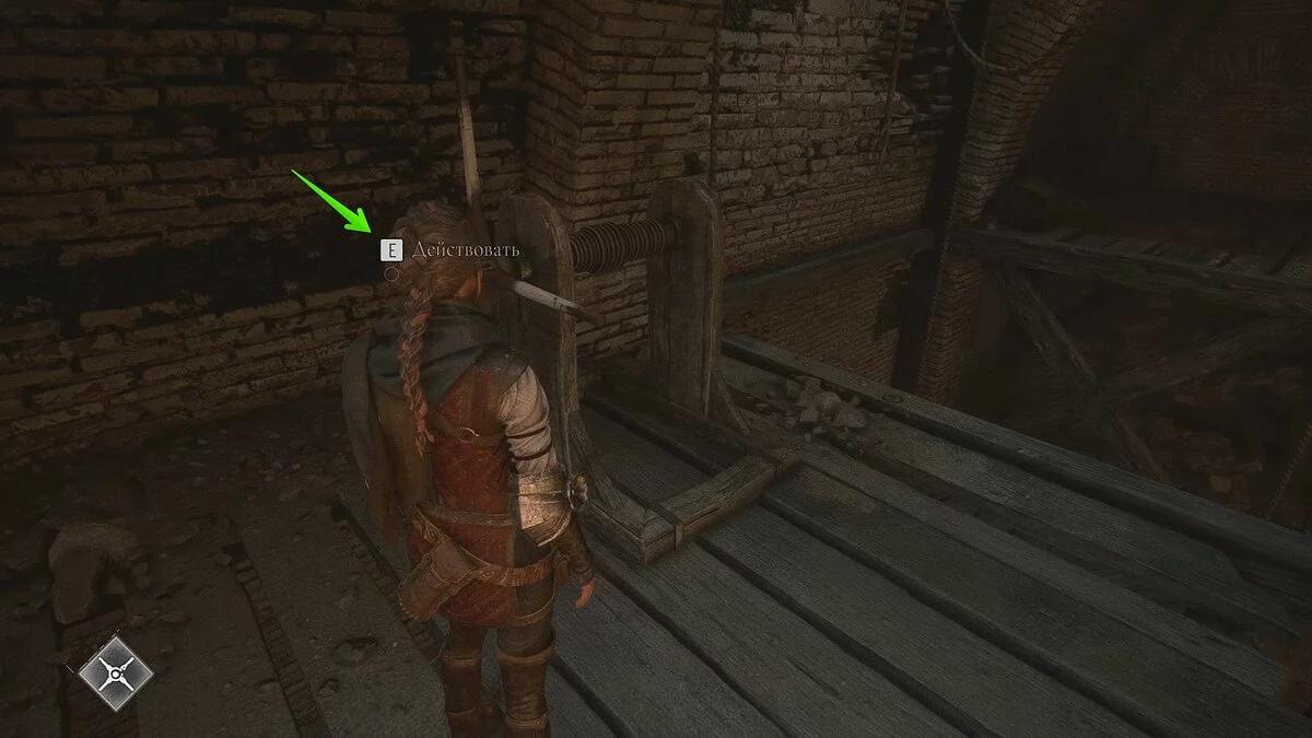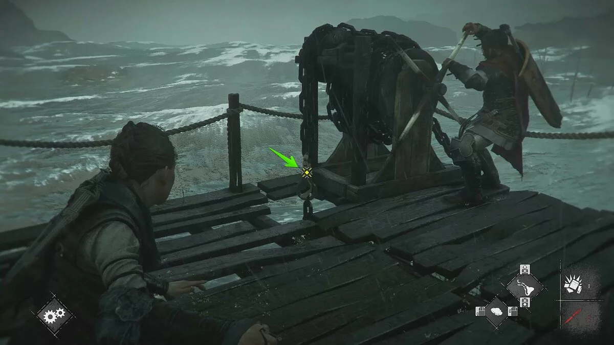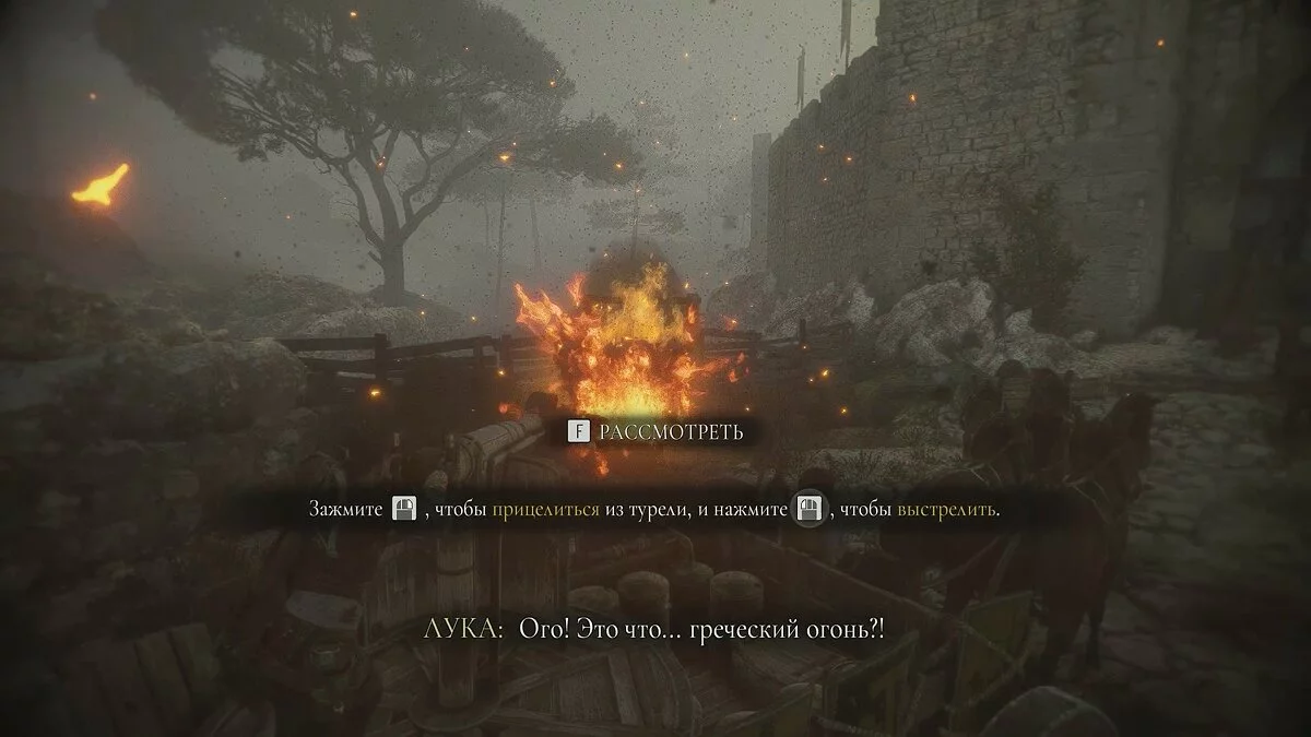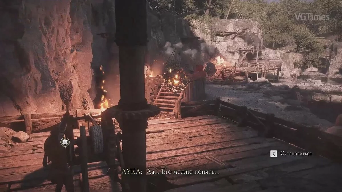 Подойдите к небольшому ящику, чтобы Лука взаимодействовал с ним. Передвиньте телегу и прикажите спутнику активировать рычаг. Стреляйте по кольцу и сдвиньте баллисту к воротам. После кат-сцены глава будет завершена.