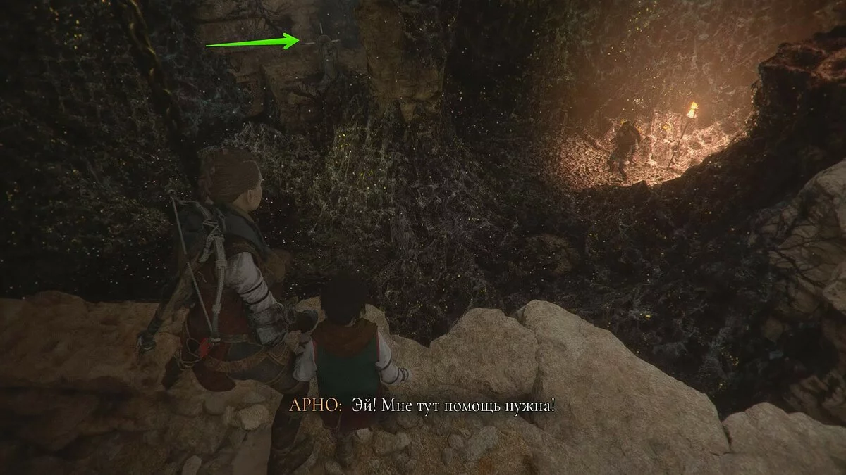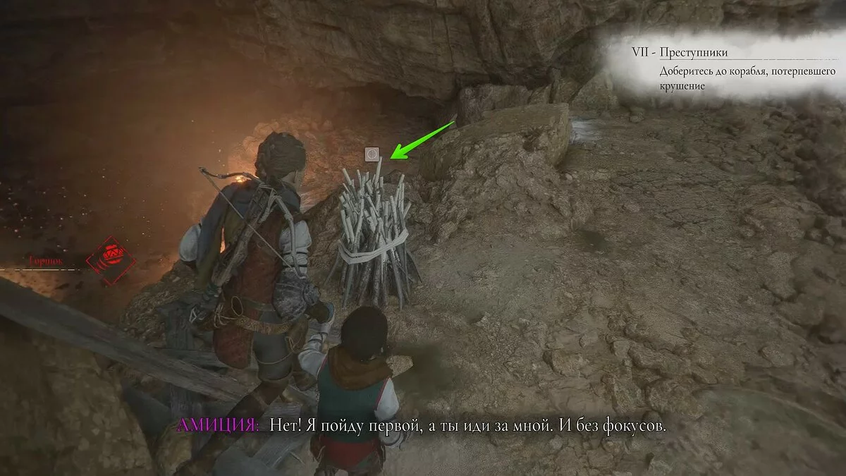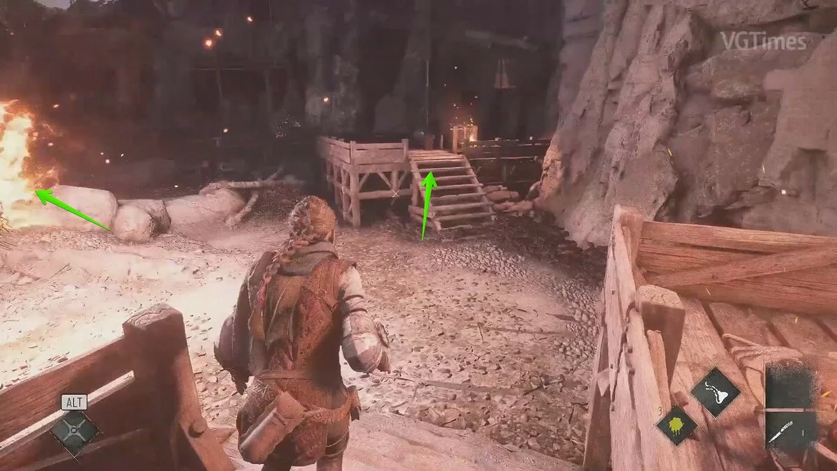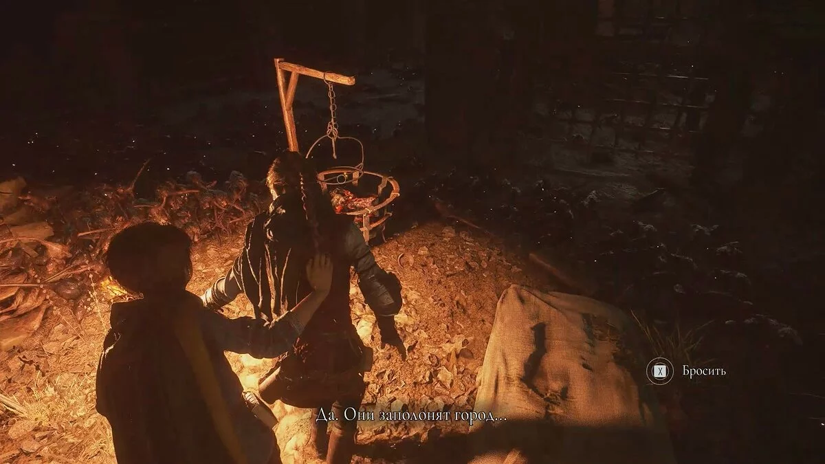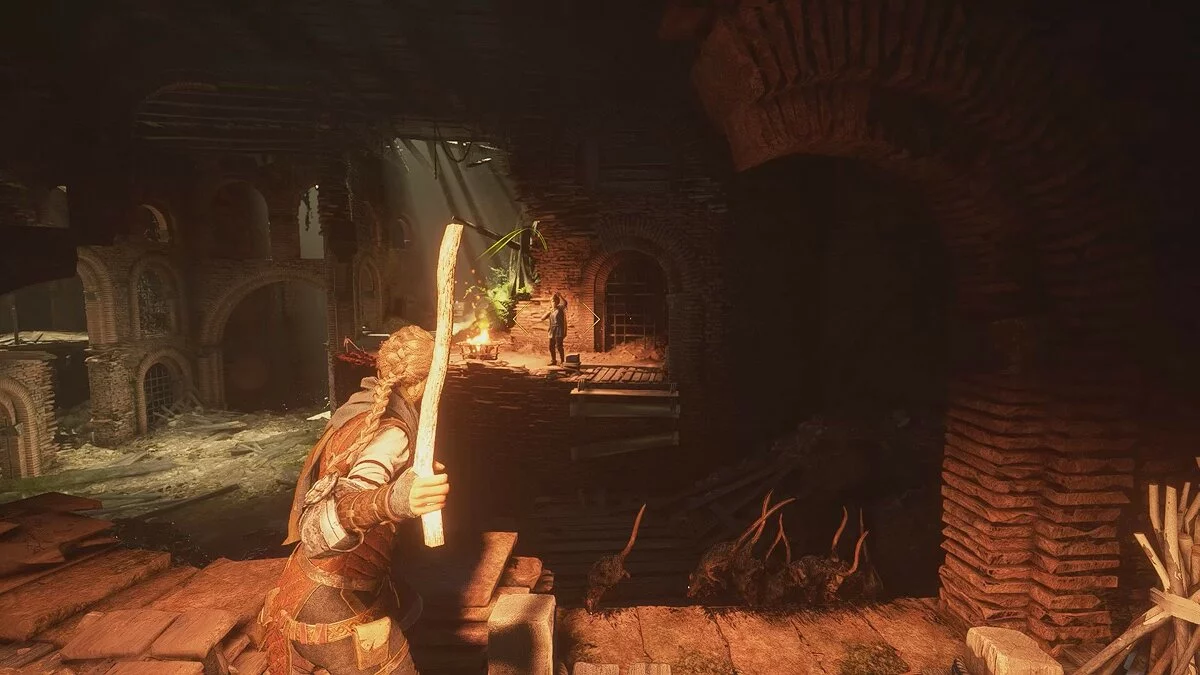 Амиция предложит спасти мужчину. Если вы хотите сохранить жизнь травнику, ознакомьтесь с этим гайдом. Чтобы пройти к выходу, возьмите палку под деревянным навесом слева. Вы также можете использовать банку с зажигательной смесью.