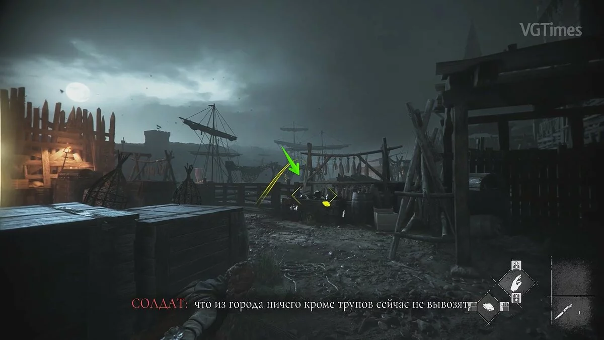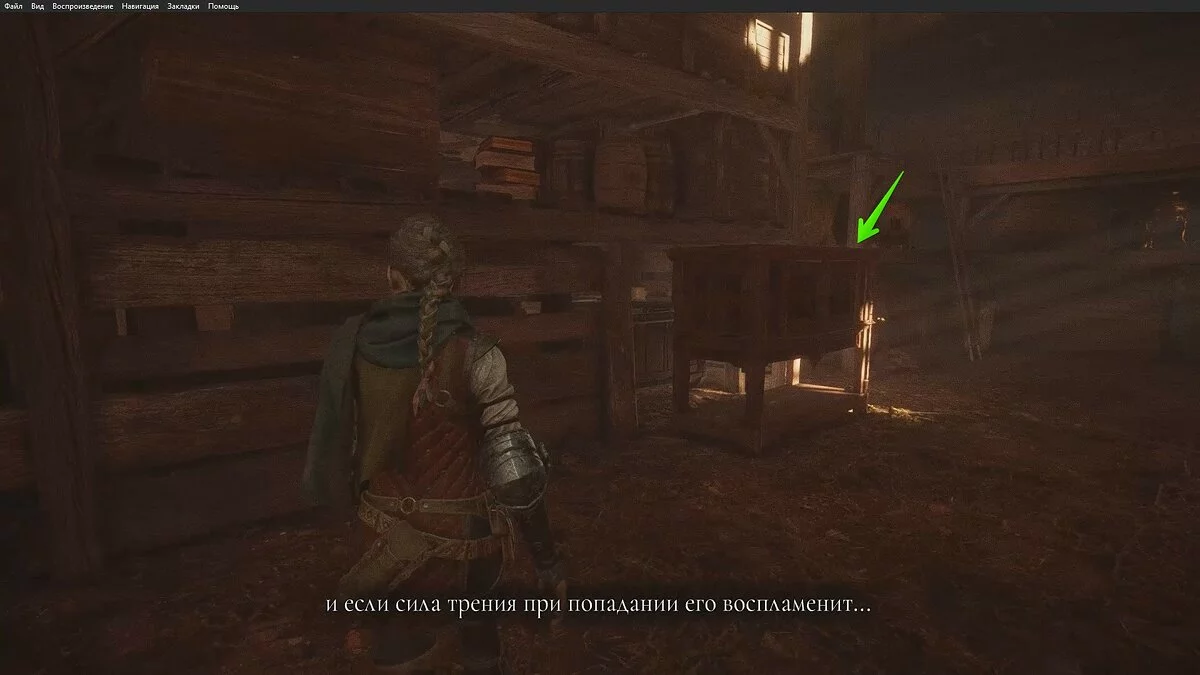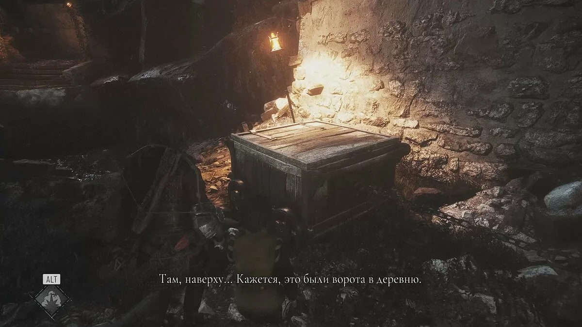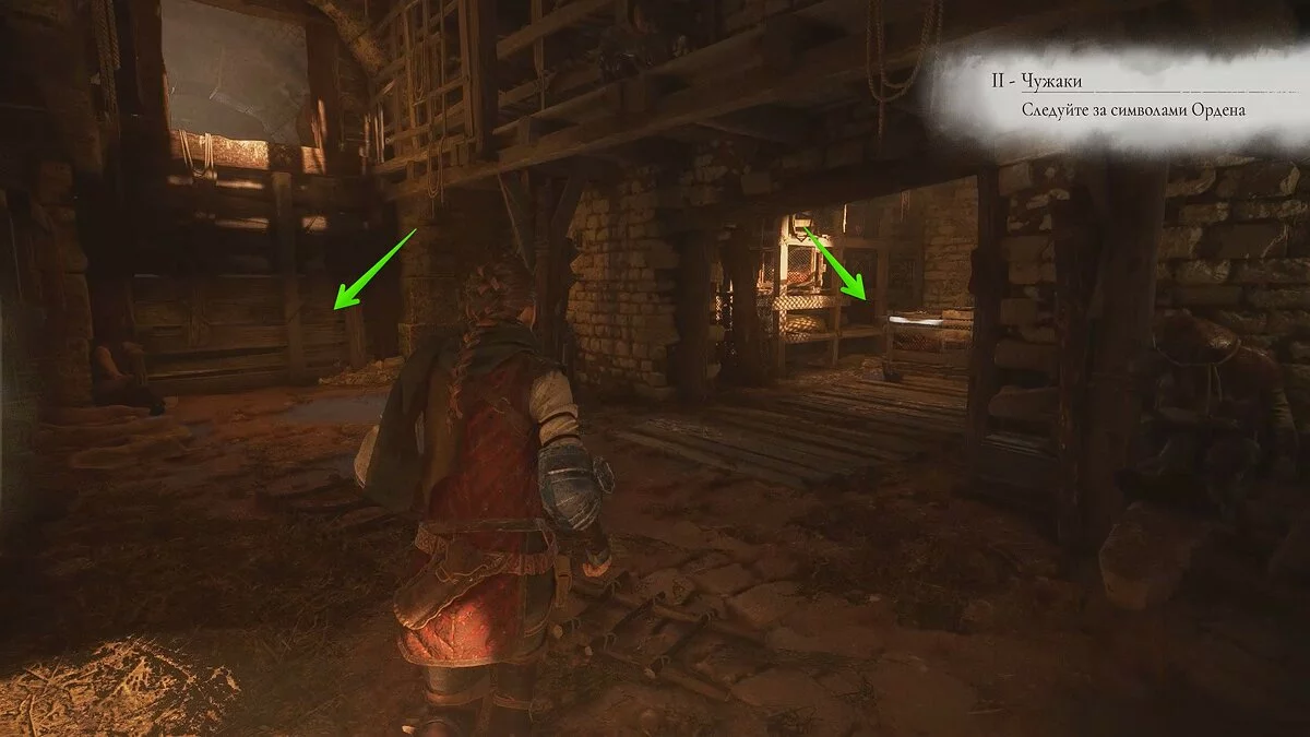 Бегите к телеге справа и толкайте её в левую сторону. Здесь вы увидите деревянные ящики. Воспользуйтесь огненным болтом, чтобы отогнать крыс. Также нужно бросить в огонь смолу. Спуститесь вниз и изучите чертежи здания. Так вы получите воспоминание.