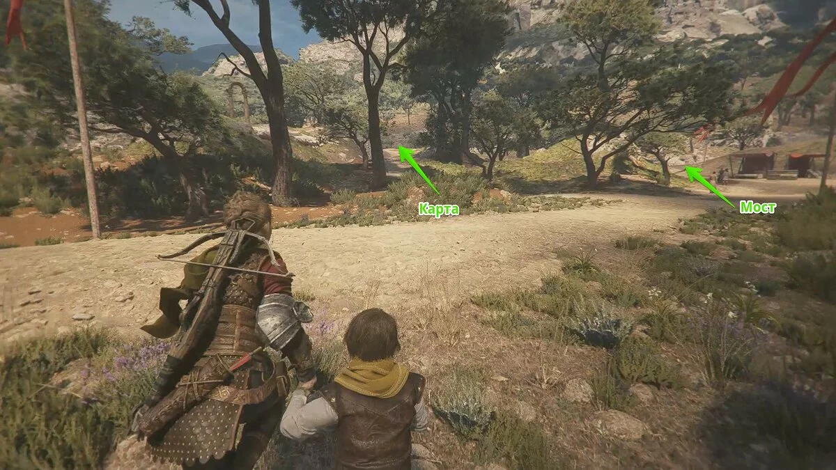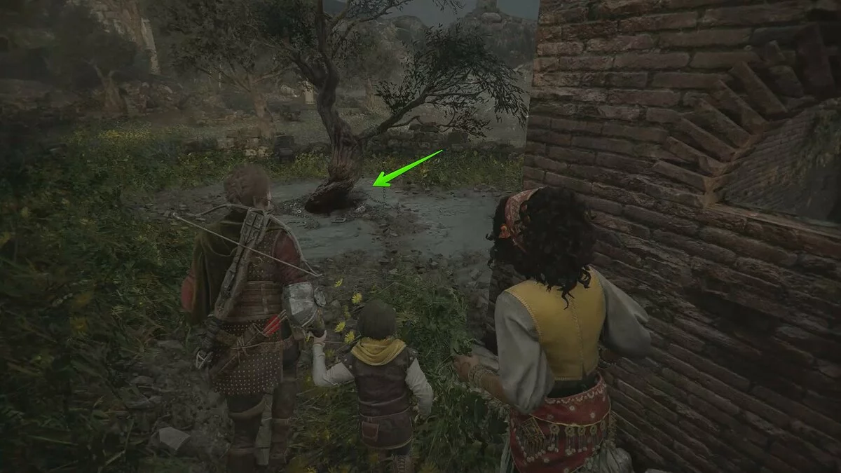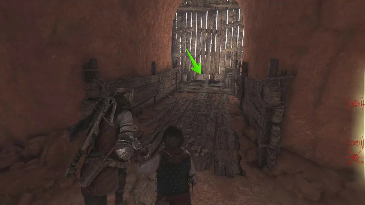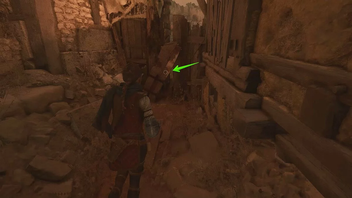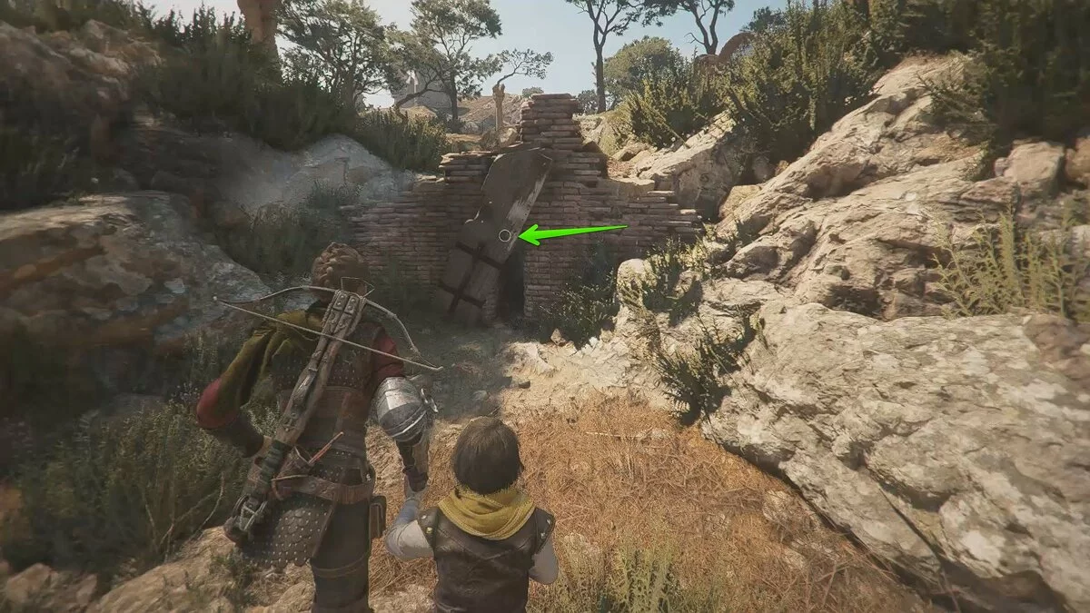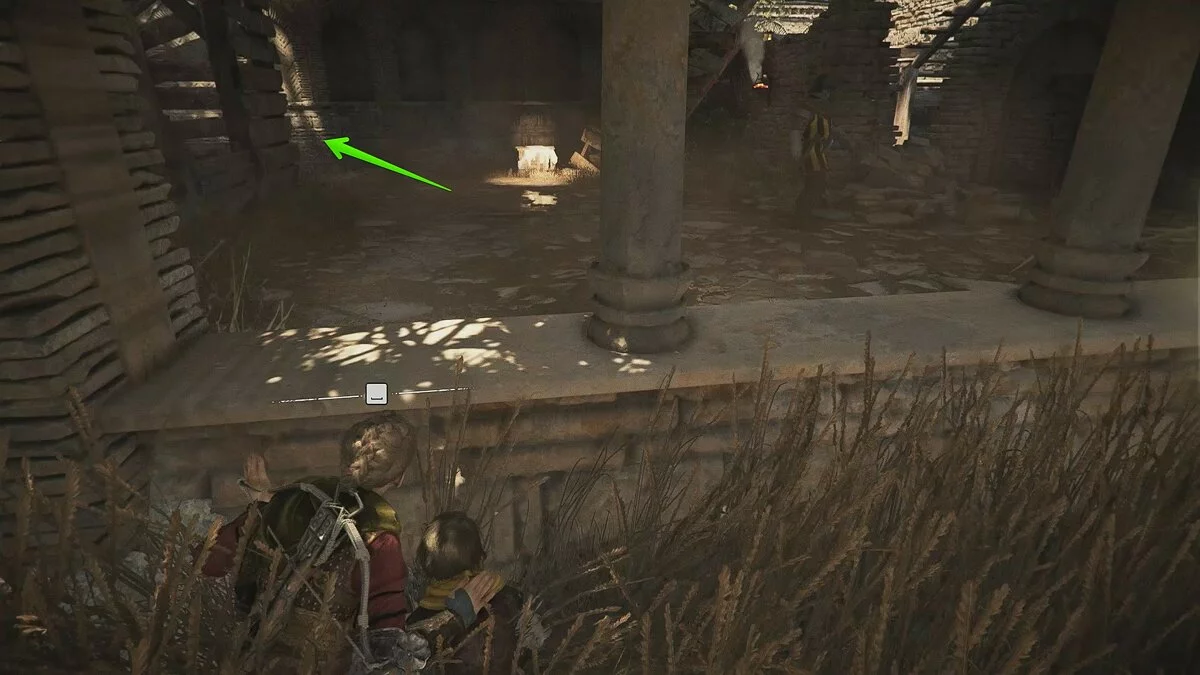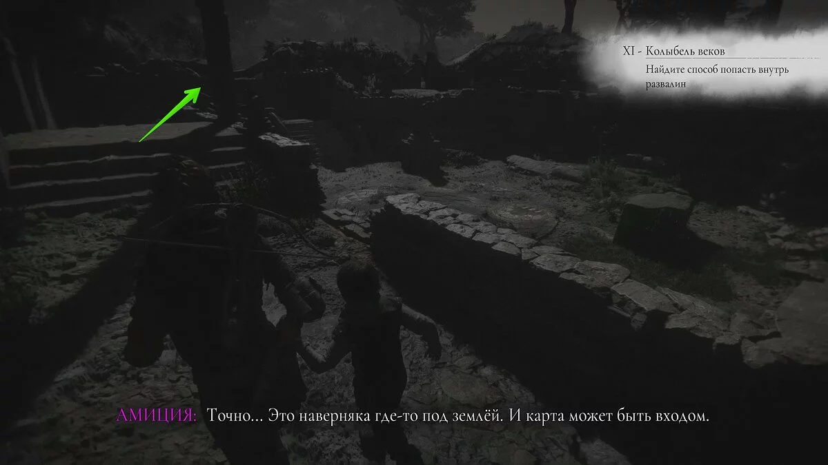 Продолжайте бежать вперёд, пока не окажетесь у развалин. Взаимодействуйте с колонной слева. Карта разрушится, открыв подземный проход.