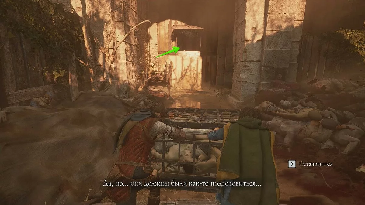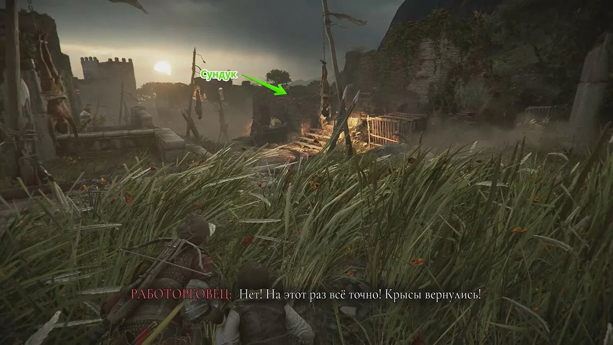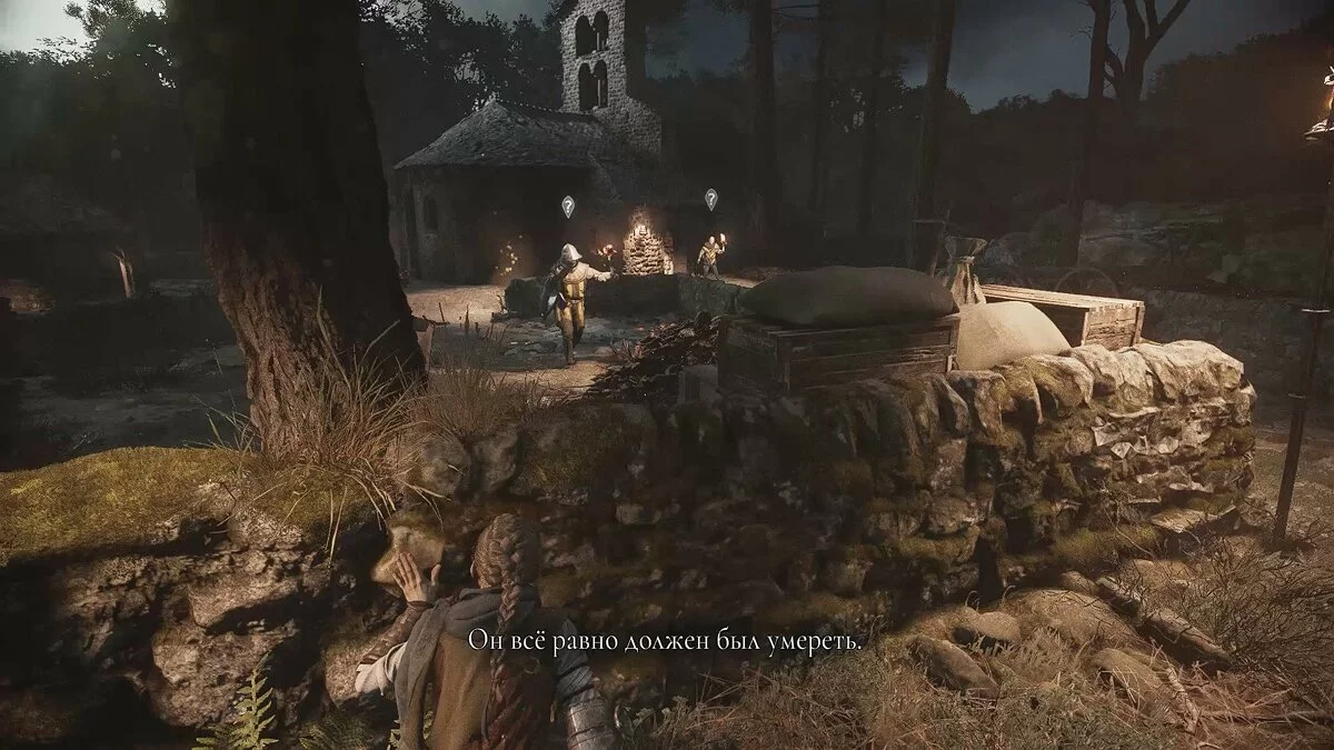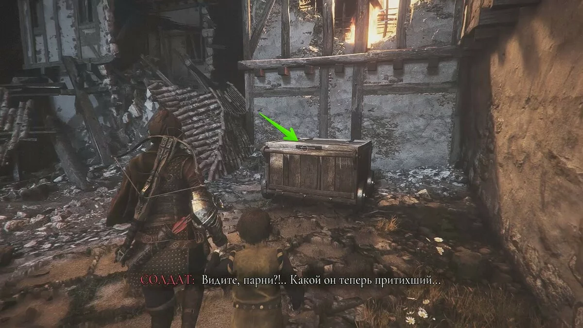 После видеоролика на движке задание обновится. Гуго попросит проследовать на центральную площадь деревни, чтобы спасти Арно. На первой локации старайтесь держаться правой стороны, а когда доберётесь до спуска, убейте всех солдат. Так вы сможете осмотреть ещё один секретный сундук, который находится посреди руин церкви.
