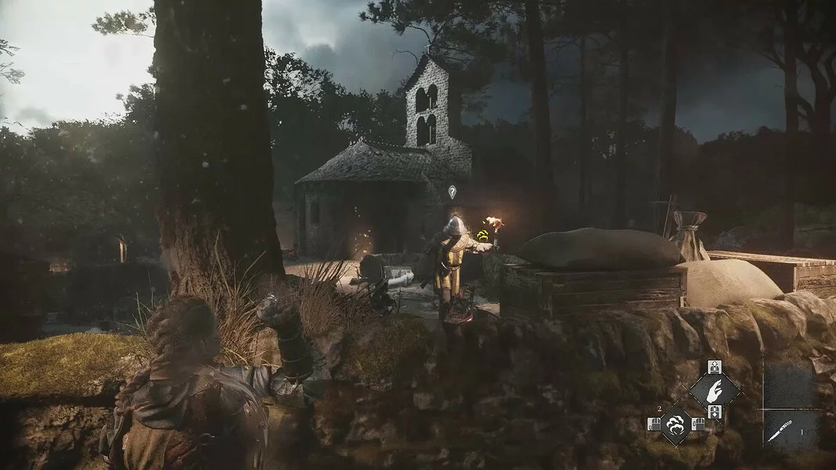 После сцены с Гуго герои наткнутся на патруль. Прячьтесь в высокой траве и используйте камни для отвлечения врагов. Также вы можете убивать их с помощью пращи. Стоит отметить, что на данном этапе прохождения оружие Амиции издаёт слишком много шума, тем самым быстро привлекая внимание врагов.