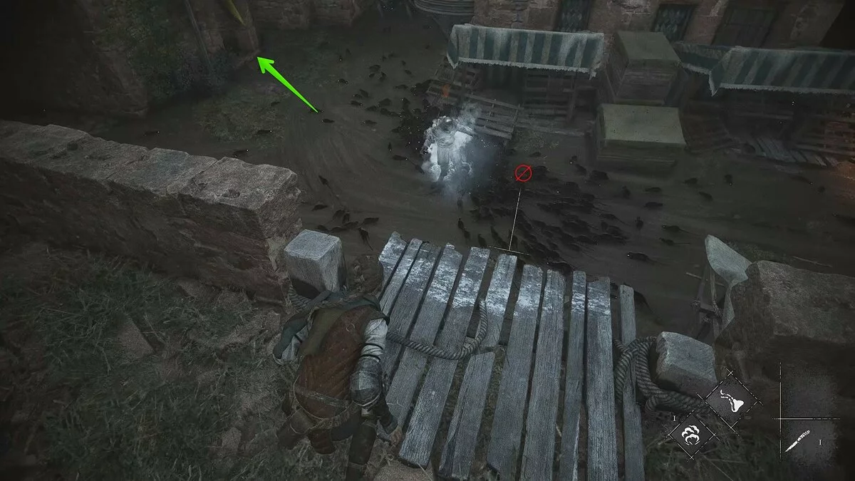 После этого войдите в здание справа и избавьтесь от лучника, который стоит на балконе. Он не даст вам спокойно перебраться через стаю крыс.