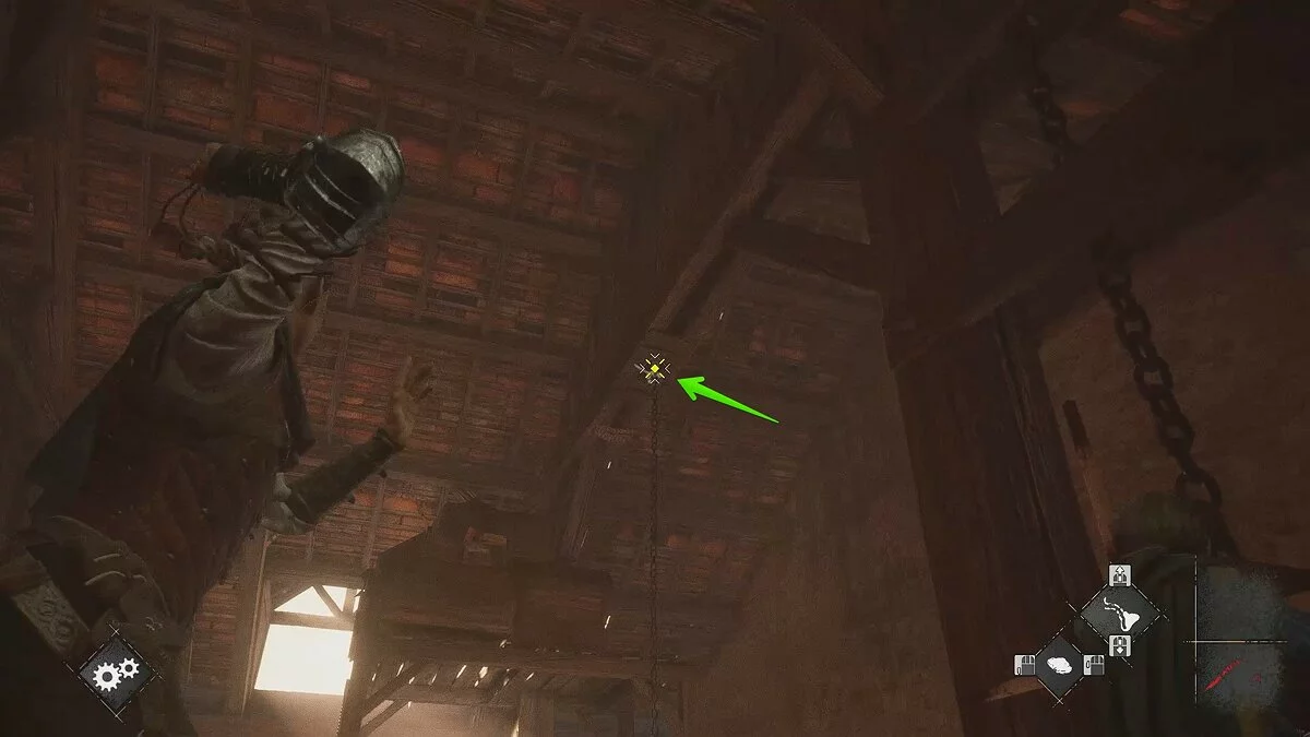 Войдите в большой зал и сбейте цепь, чтобы мост начал подниматься. Некоторые секции не поднимутся, придётся спуститься и разобраться с этим.