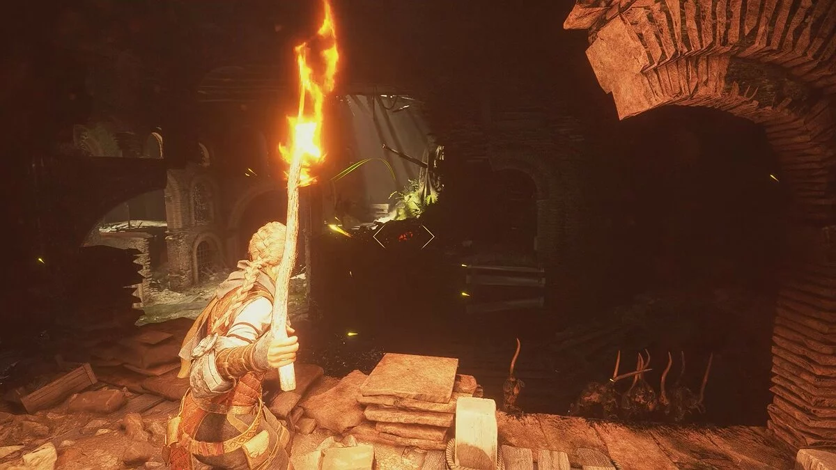 Хватайте факел и двигайтесь до следующей контрольной точки. Поставьте факел в подставку и переберитесь через стену. Здесь факел будет недоступен, но вы сможете воспользоваться обычными палками. Они горят всего несколько секунд. Вам нужно успеть добраться до большого напольного факела и зажечь его. Повторите действия несколько раз.