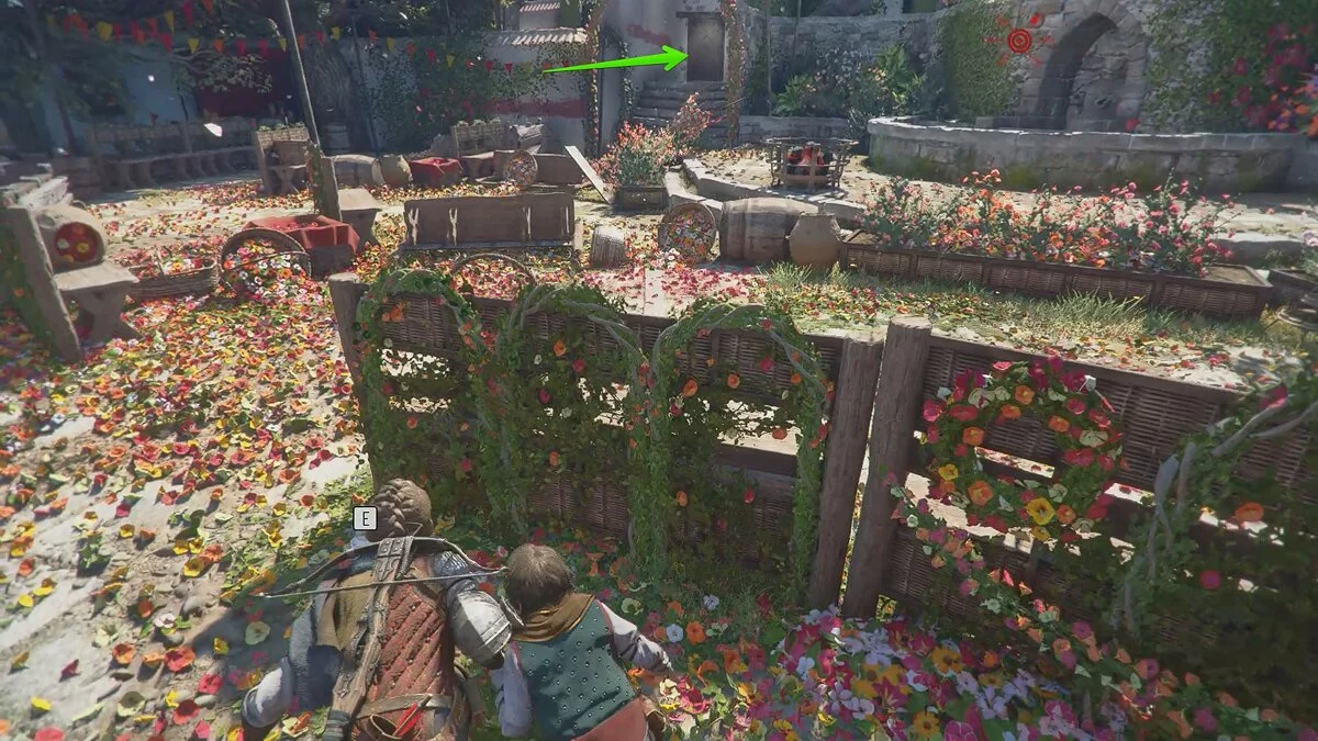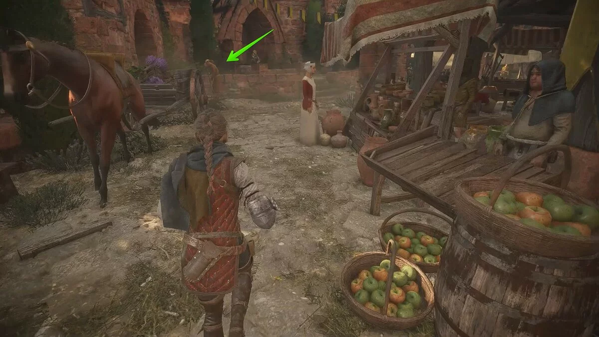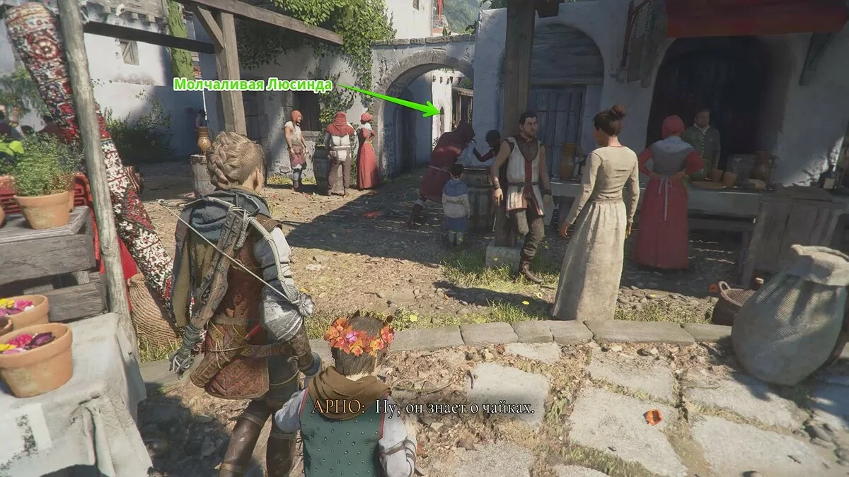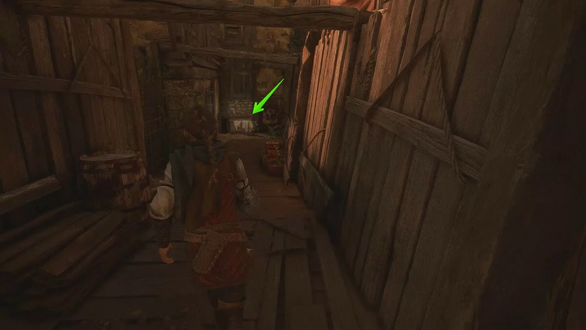 Следуйте по улицам города и заходите в башню по пути можно найти ингредиенты. После башни поверните направо и найдите коллекционный предмет «Горечавку». Пройдите вперёд и заберитесь по лестнице. Здесь можно отыскать воспоминание «Шёлковое сокровище». Для этого подвиньте телегу к стене и заберитесь наверх.