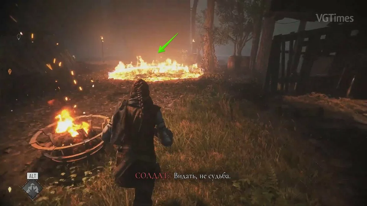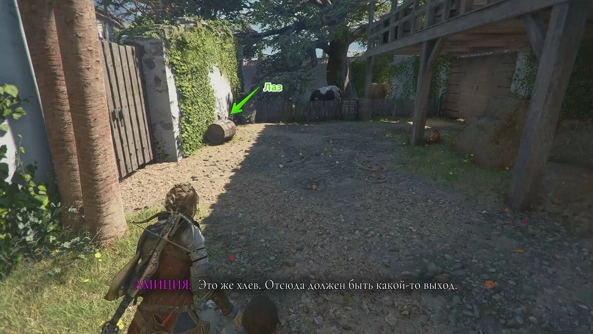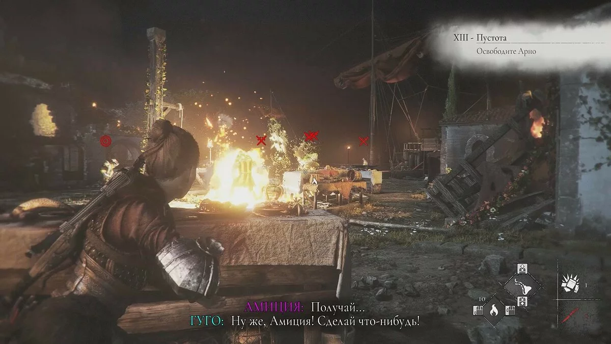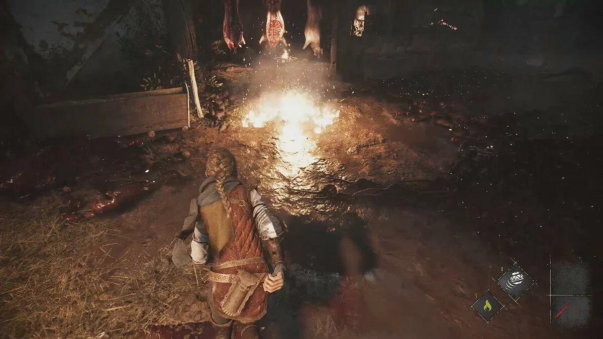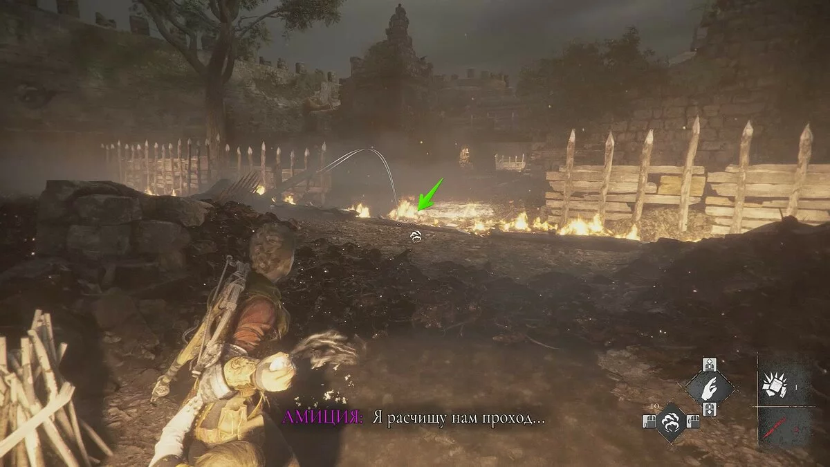 Подождите, пока охранники уйдут в левую часть локации и бросайте горшок с зажигательной смесью в крыс. Пробегите прямо по огню и спрячьтесь в траве. Амиция получит урон, но это не смертельно.