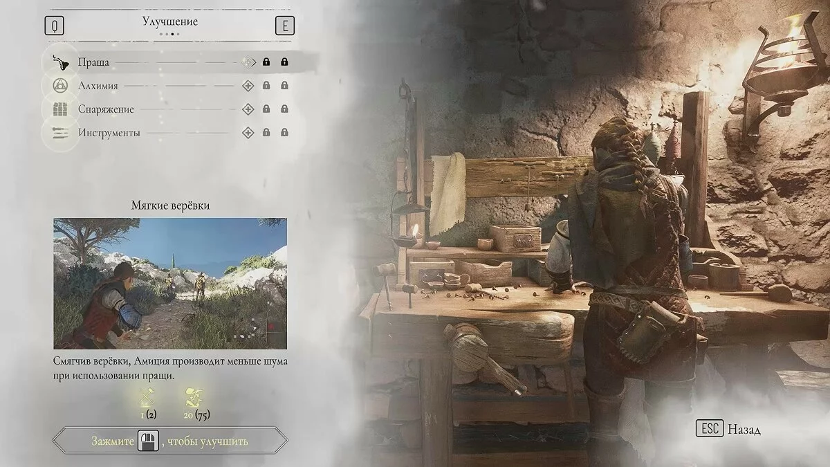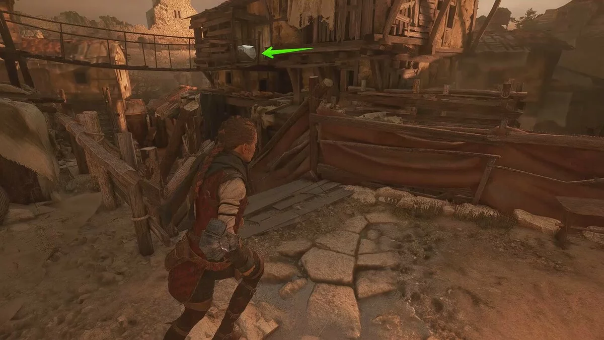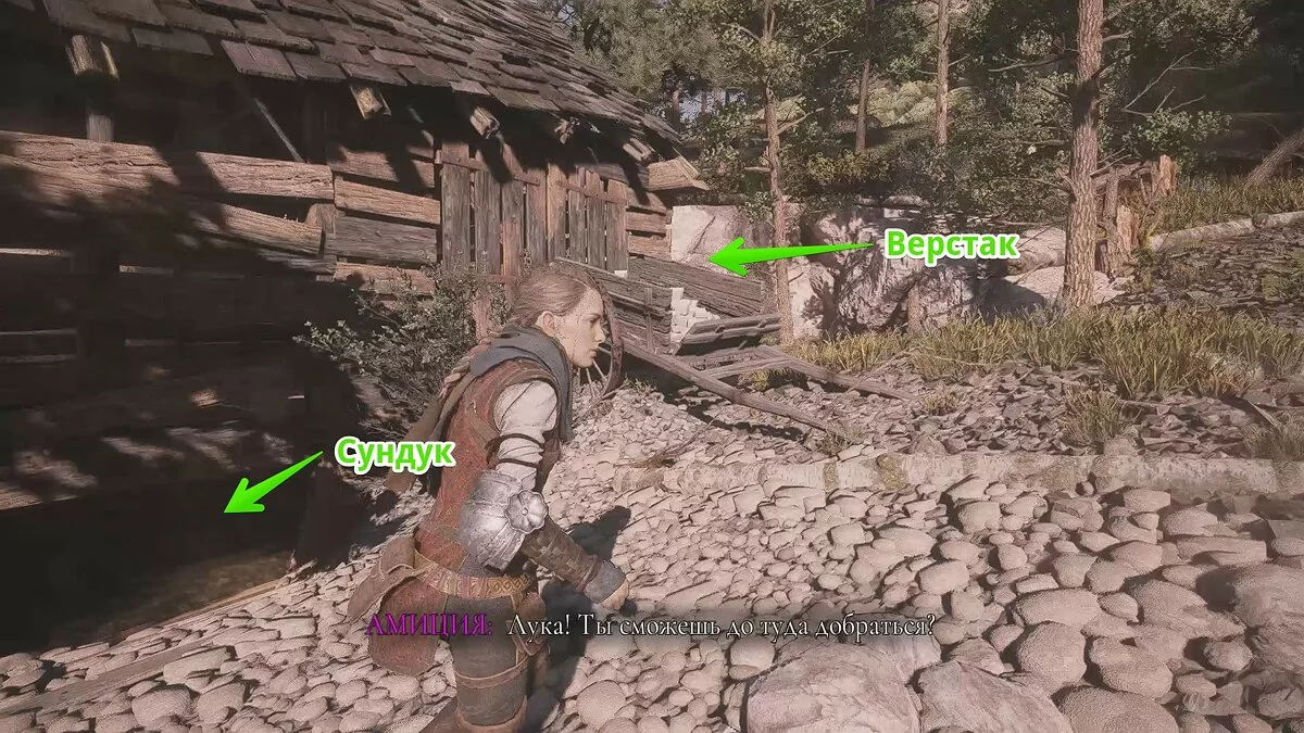 Войдите в единственное здание и соберите ресурсы на ящиках рядом с лестницей. Здесь же вы впервые увидите верстак. С его помощью можно приобретать улучшения для пращи и инвентаря Амиции.