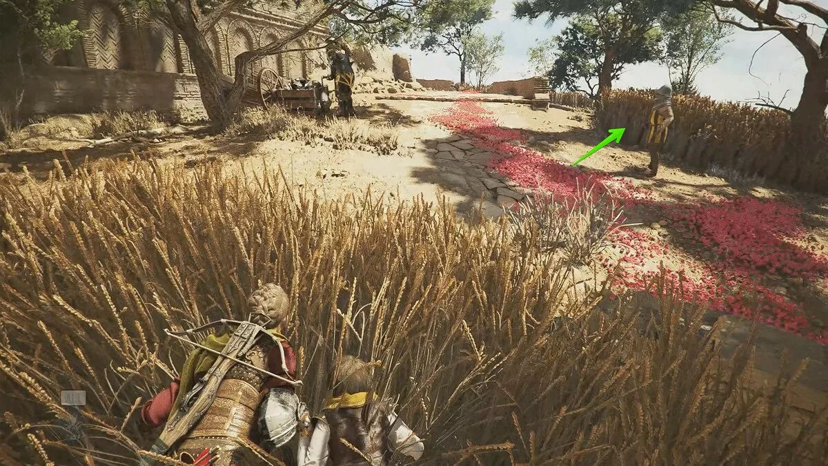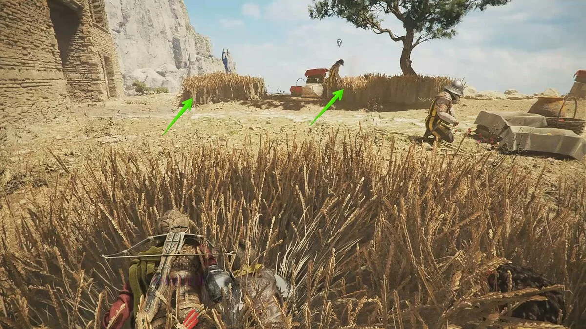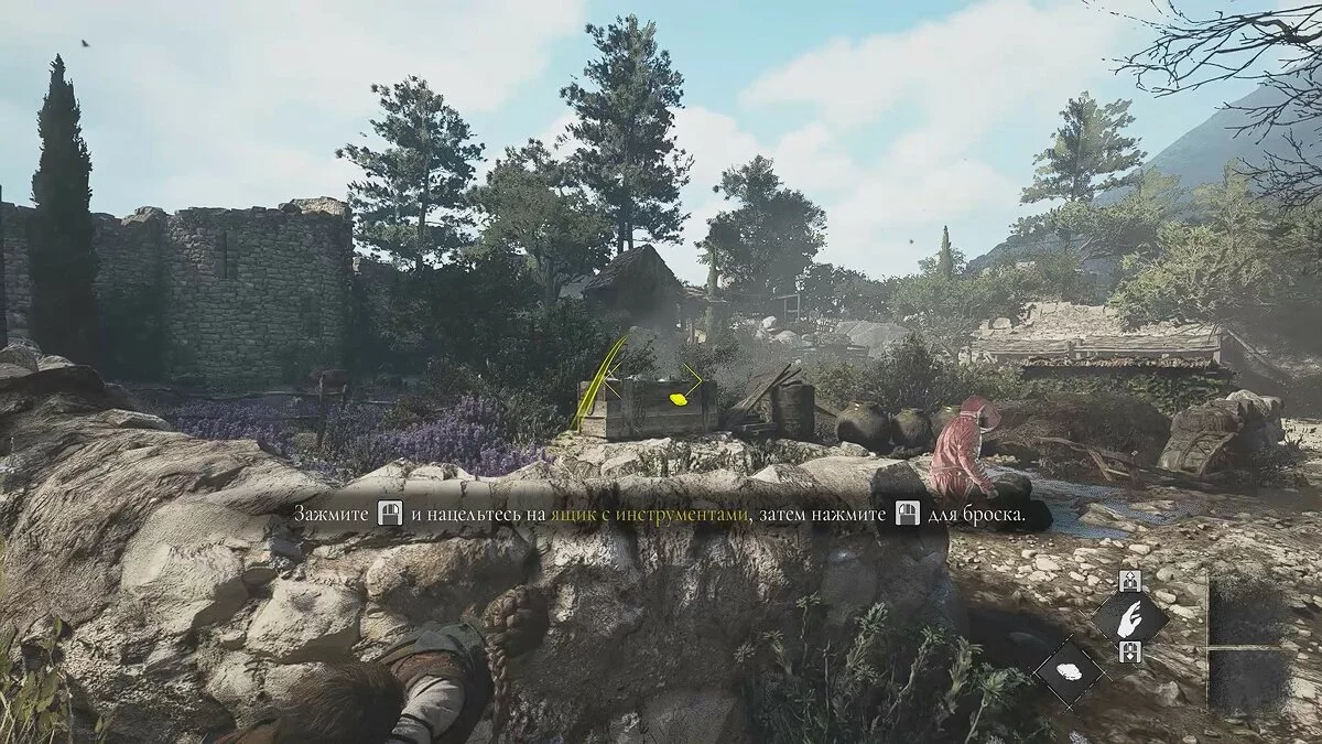 Посмотрите сцену с наёмником. Пригнитесь и обойдите его сзади. Во дворе вы также увидите одного врага. Отвлеките его броском камня в оружейный ящик. В здании также можно отвлечь наёмника похожим способом.