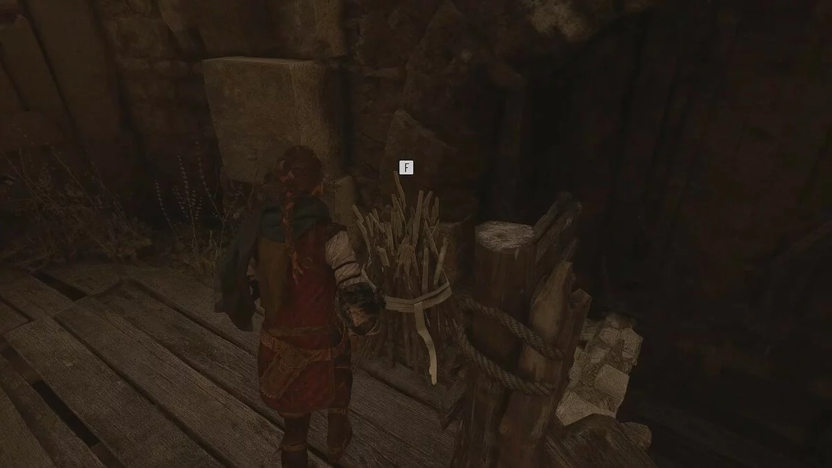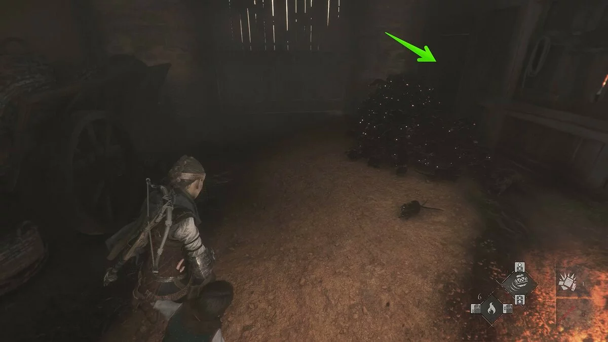 На данный момент в вашем распоряжении довольно много инструментов, чтобы противостоять крысам. Просто следуйте всё время вперёд, пока не доберётесь до ангара, в котором находился секретный сундук. Стреляйте в деревяшку горящим болтом. Отсюда вы сможете отодвинуть бревно и освободить телегу с жаровней.