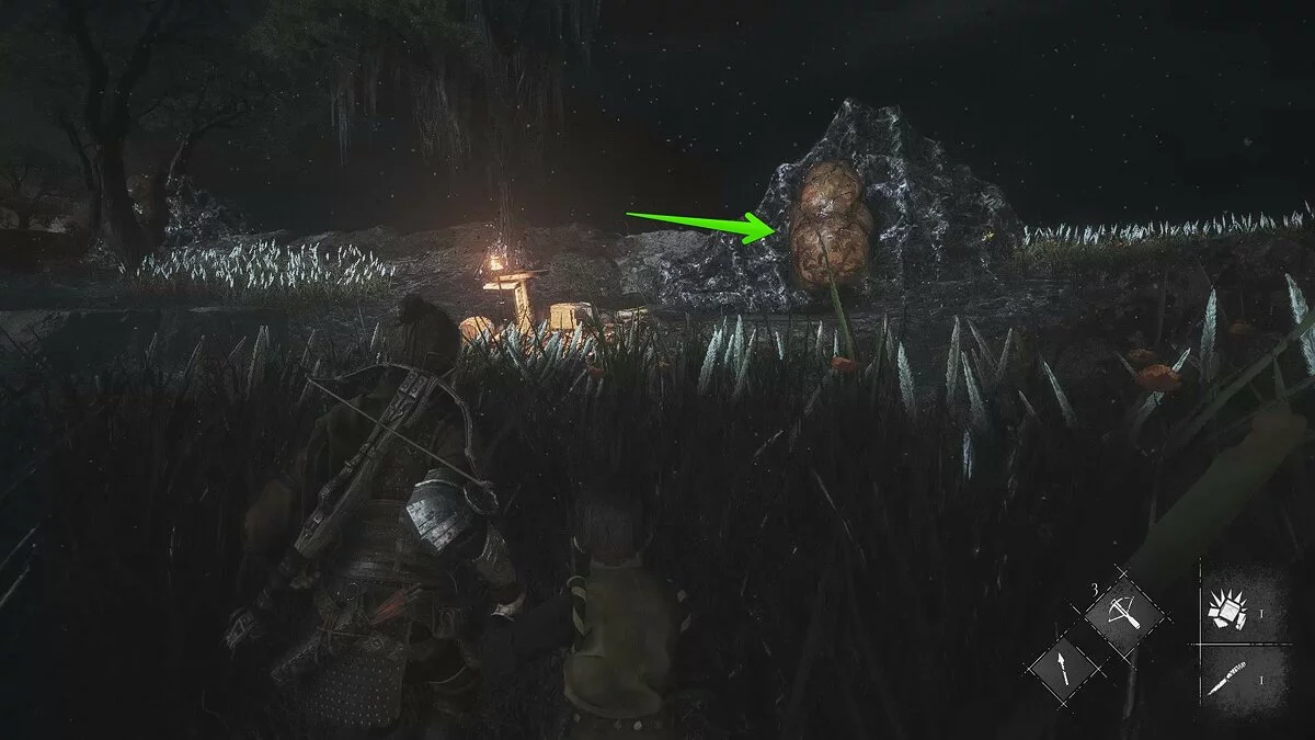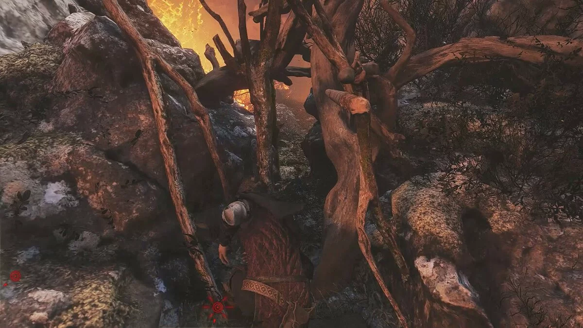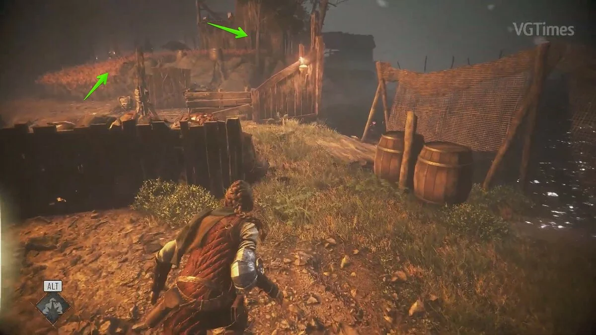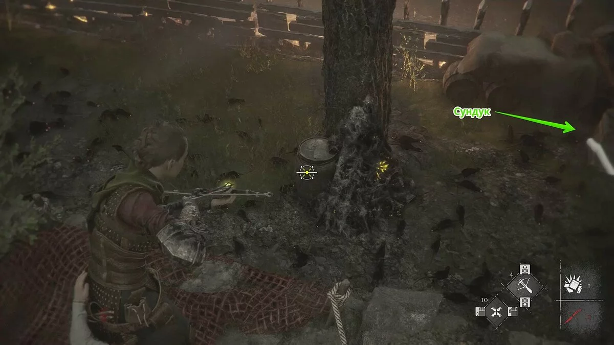 Подожгите хворост, чтобы добраться до безопасного места. Здесь вы встретите нескольких врагов. Разберитесь с ними, но не спешите перебираться на другую сторону. Осмотрите заднюю левую часть локации. Под деревом находится секретный сундук. Можете отвлечь крыс болтом с приманкой, выстрелив в бочку рядом с деревом.