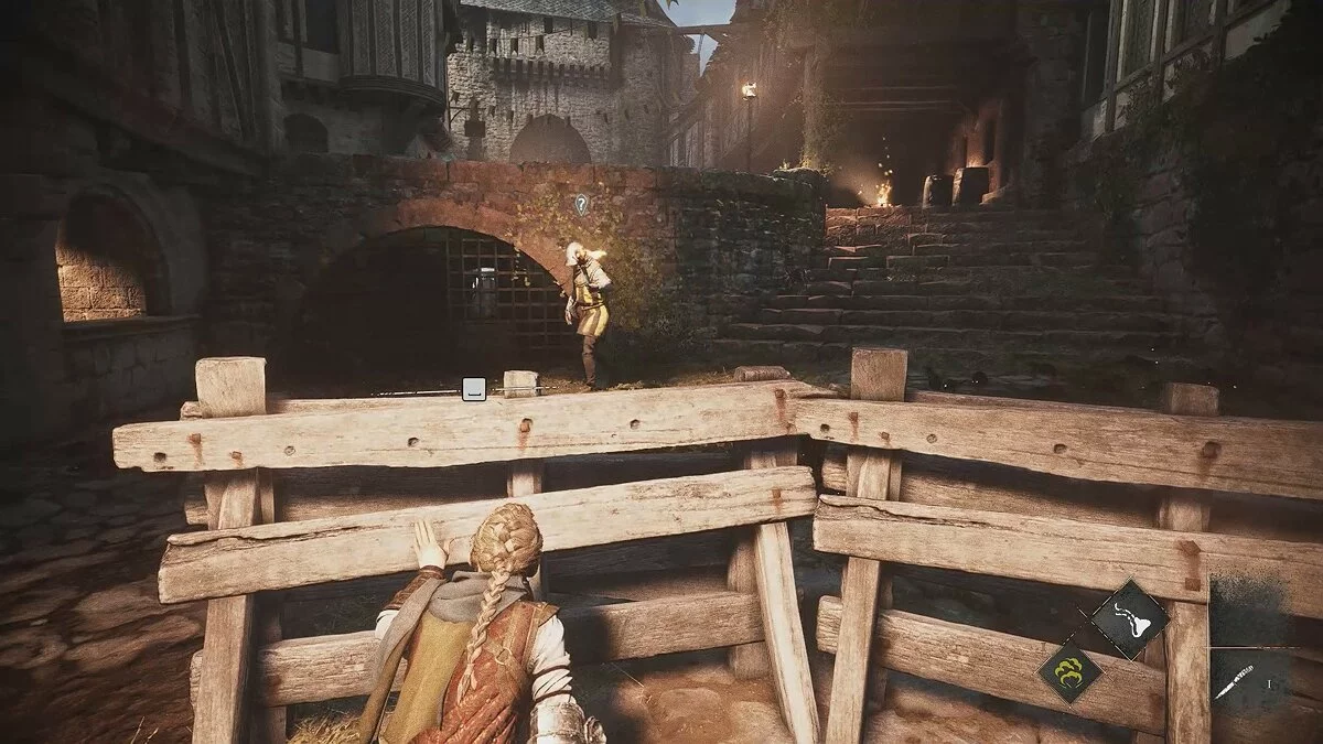 Выбравшись из канализации, вы вернётесь в предыдущую локацию. Бегите к мельницам. Слева от них есть решётка. Ранее она была заперта, но сейчас вы сможете пройти к башне.