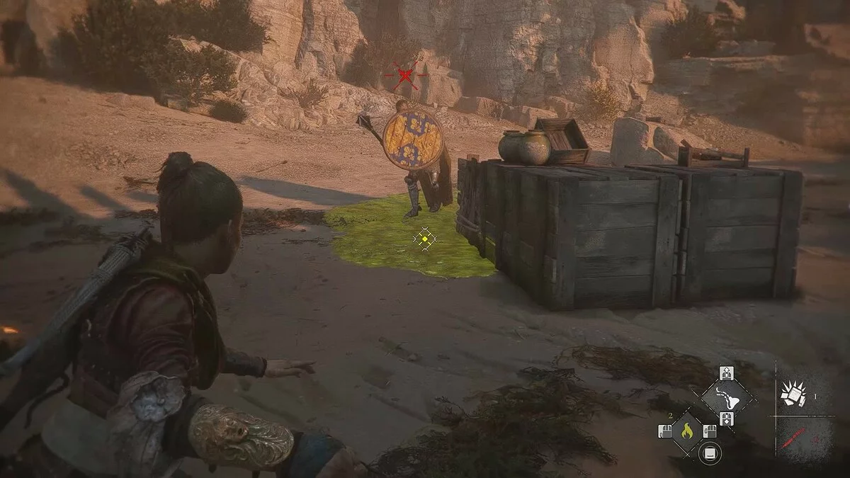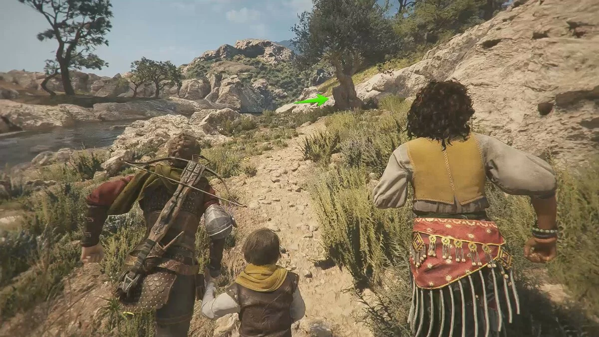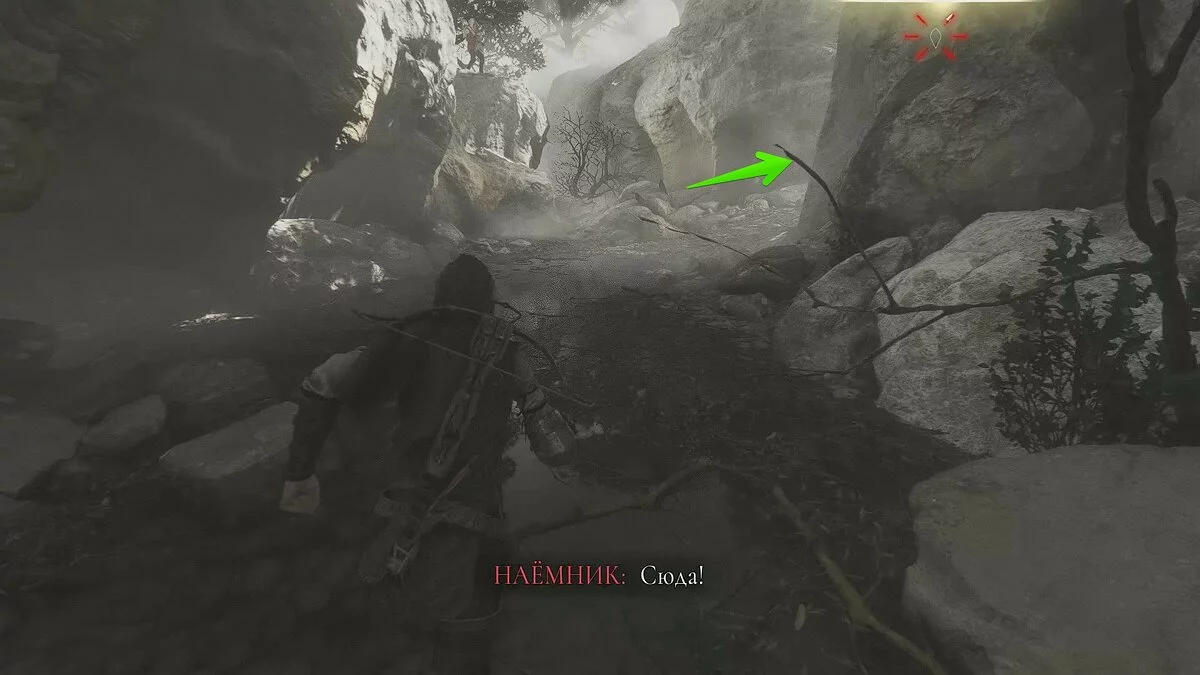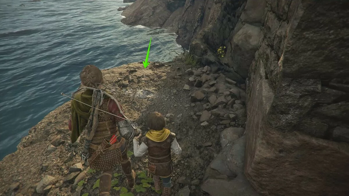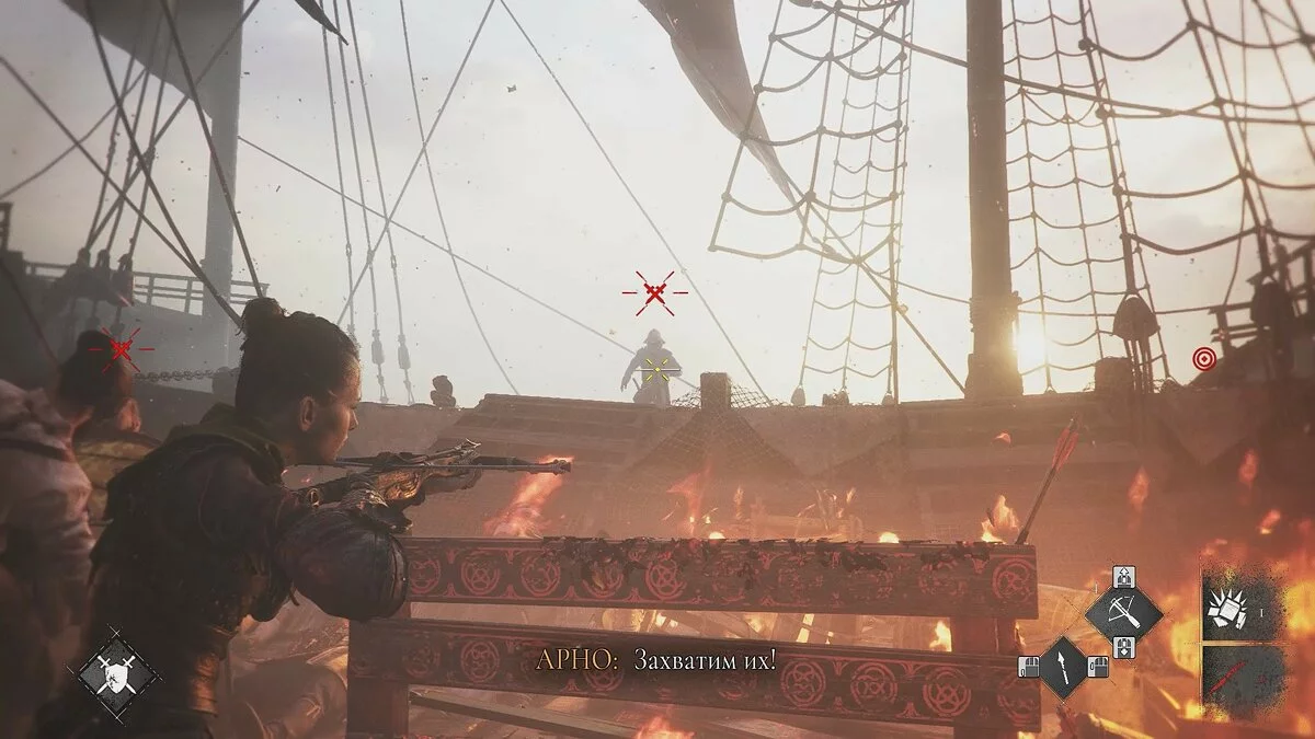 После кат-сцены используйте крюк и арбалет. Продолжайте следовать по берегу, пока не наткнётесь на труп. Так вы окажетесь во враждебной локации с десятком работорговцев.