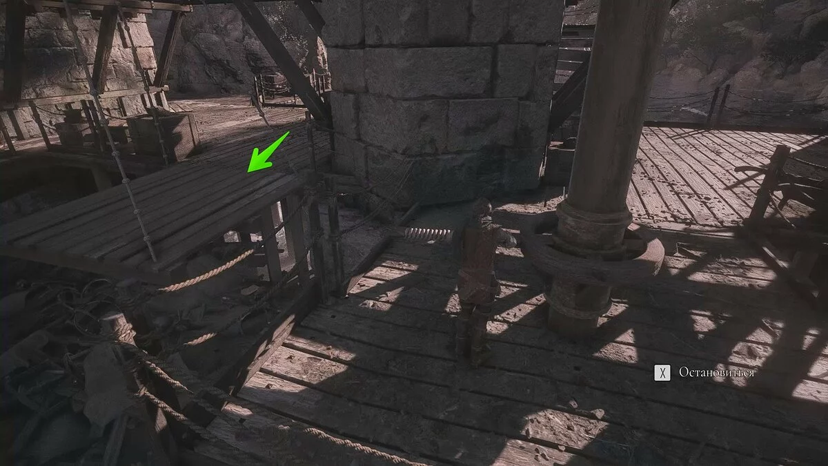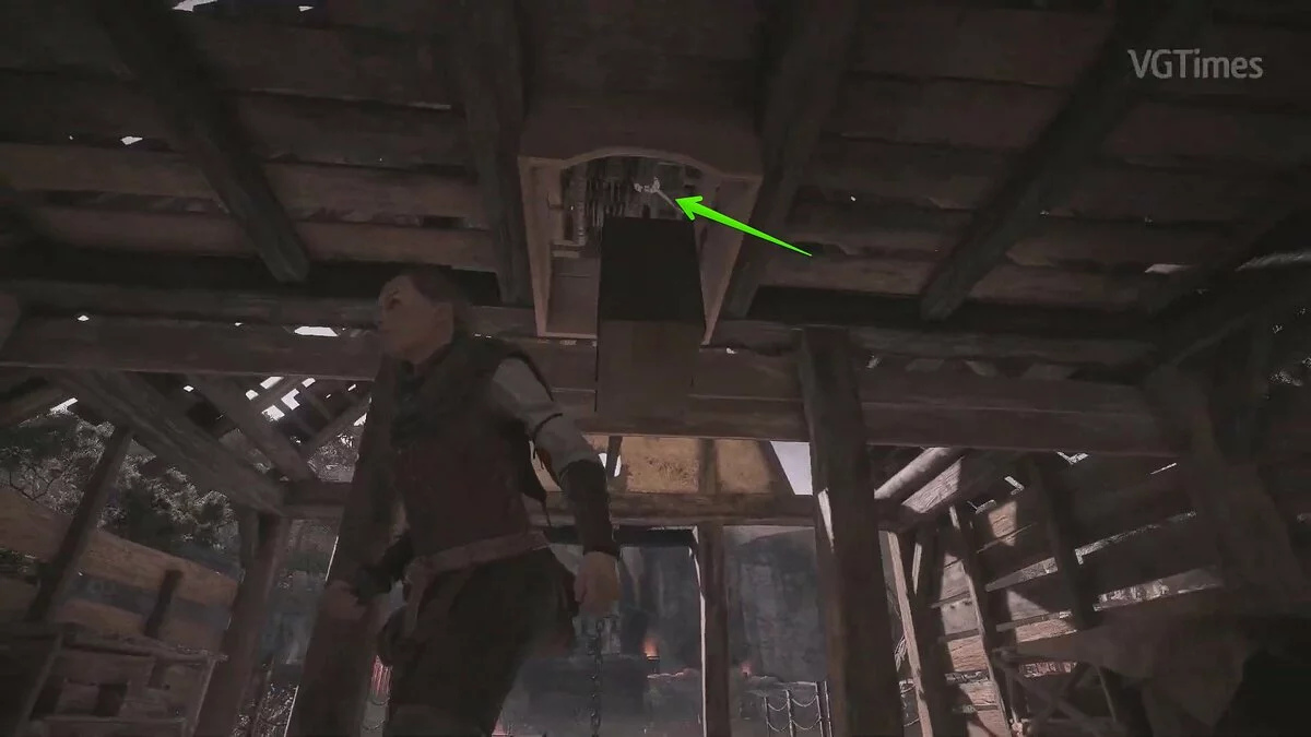 Вернитесь назад и зацепите крюк на телегу. Потяните его, чтобы запустить кат-сцену.