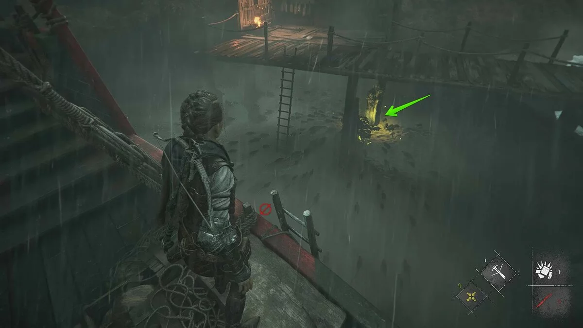 Поднимитесь по лестнице на второй этаж и избавьтесь от цепи, чтобы опустить платформу. Так вы сможете изучить карту Гиени и получить воспоминание (3) «Наш дом».