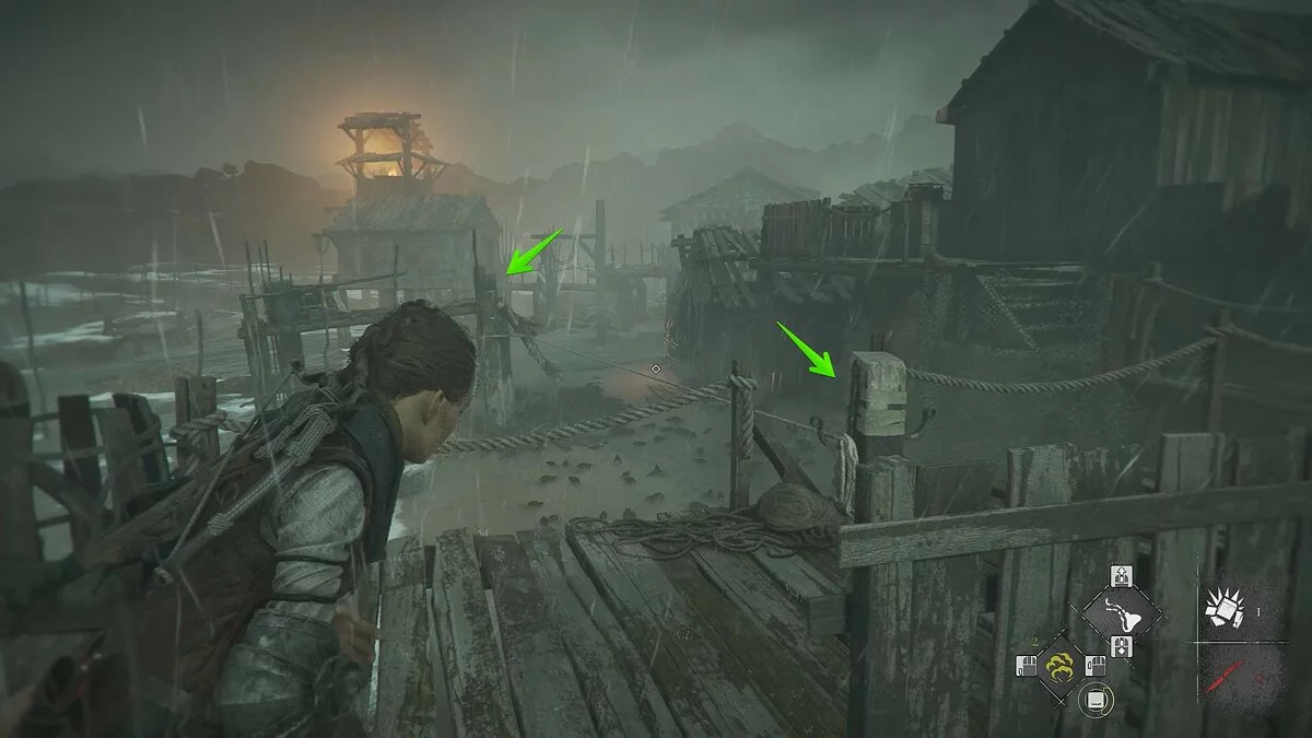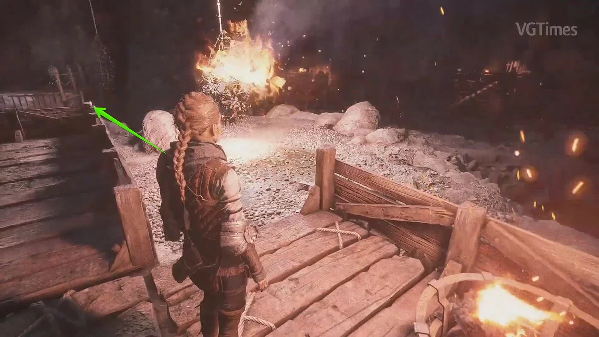 Вернитесь обратно и толкайте тележку до упора влево. Вернитесь к центральной жаровне. При помощи крюка подтяните оставшиеся две телеги. Вам нужно толкать их вправо, чтобы разглядеть позади сломанной телеги взрывоопасную бочку. Стреляйте по ней и откройте путь к мосту.