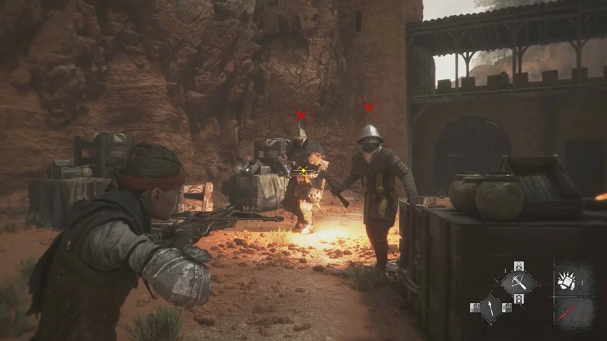Используйте арбалет, пращу и различные элементы окружения, мешки с селитрой, кувшины со смолой и горшки, чтобы разобраться с оппонентами. Когда последний будет убит, запустится видеоролик на движке, после которого необходимо за отведённое время убить графа, бросив камень при помощи пращи.