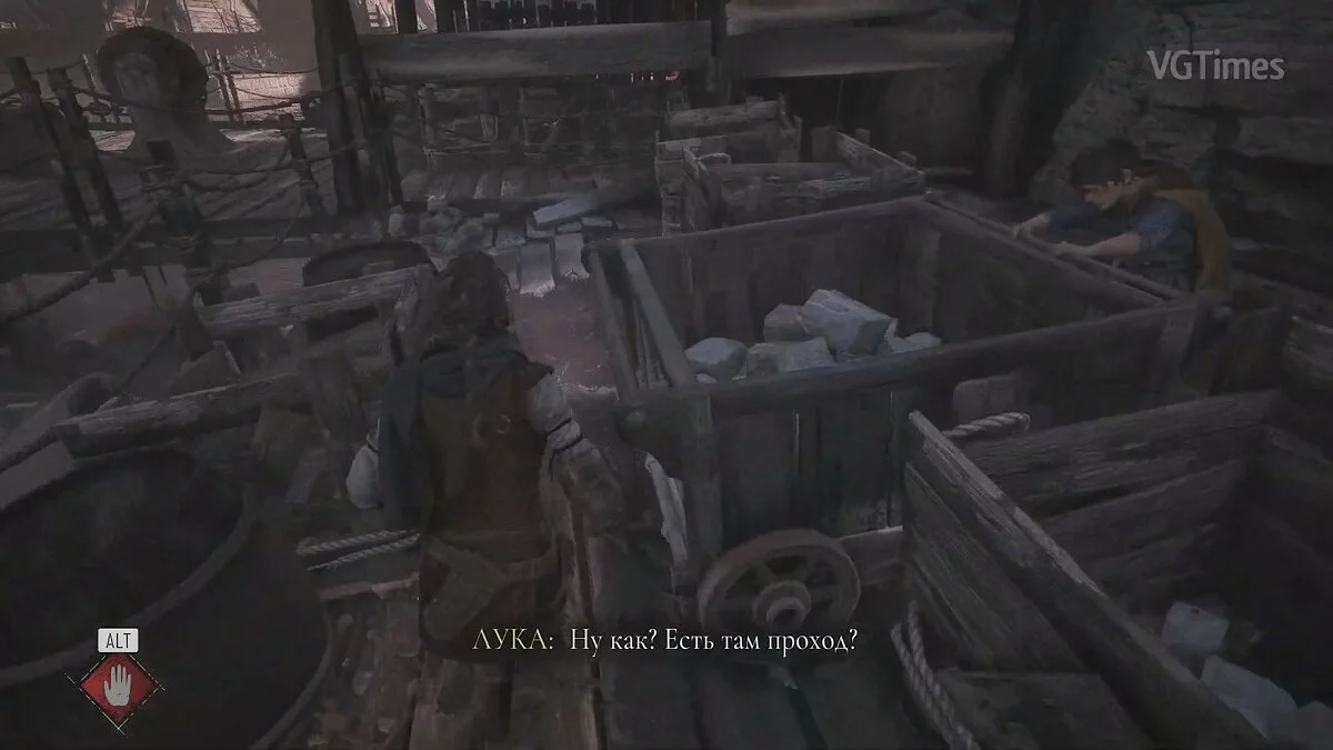 Теперь следуйте в комнату слева. Поднимитесь по лестнице и прикажите Луке взаимодействовать с рычагом. Для этого зажмите кнопку «Alt», направьте курсор на рычаг и нажмите «E».