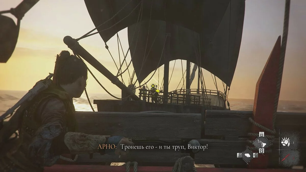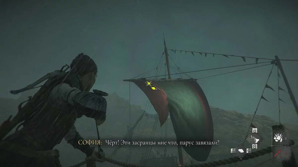Поговорите с Гуго, Арно и Лукой. Когда будете готовы, поднимитесь на мостик и взаимодействуйте с Софией. Вы увидите, как корабль нагоняет судно графа. Помогите Арно раскрыть парус, но это ни к чему не приведёт. Вскоре люди Виктора возьмут корабль Софии на абордаж.