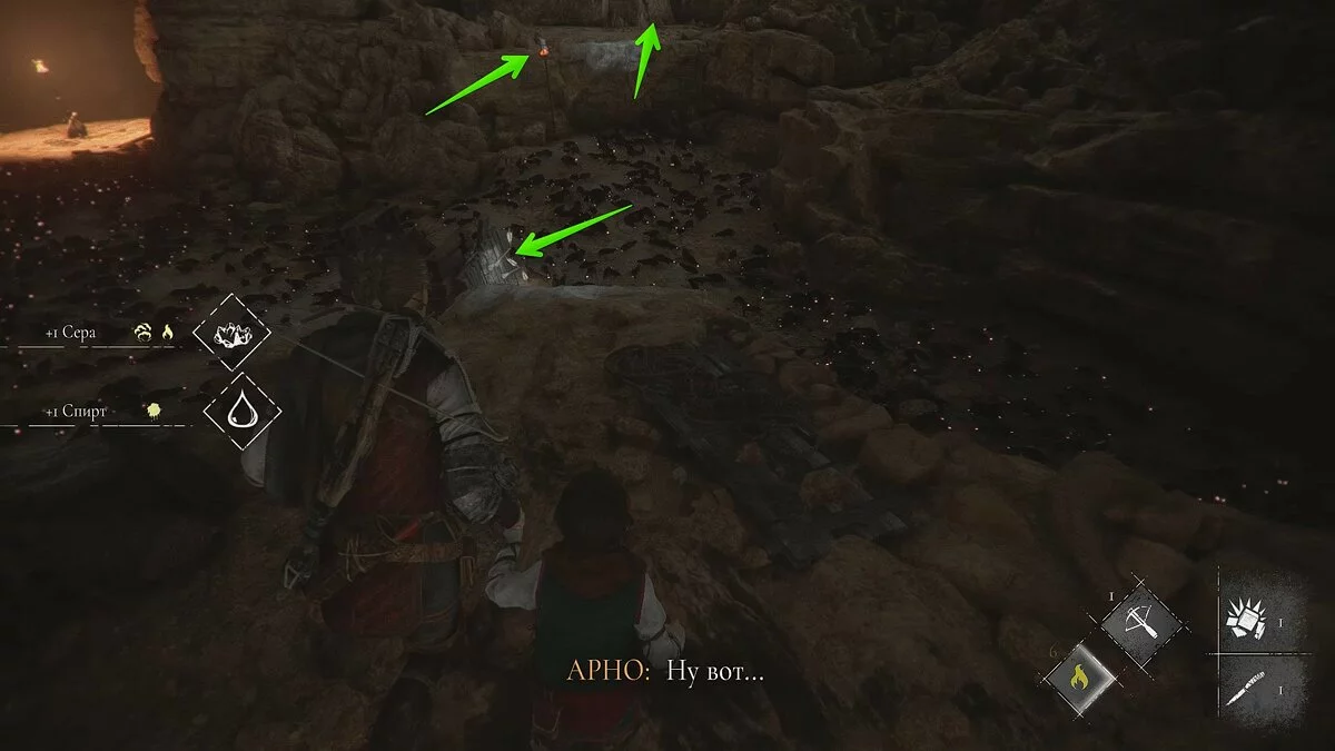 Выслушайте своего спутника. Он даст вам немного селитры и разблокирует новый рецепт. С помощью него теперь вы можете гасить вражеские факелы, тем самым позволяя крысам добраться до недругов.