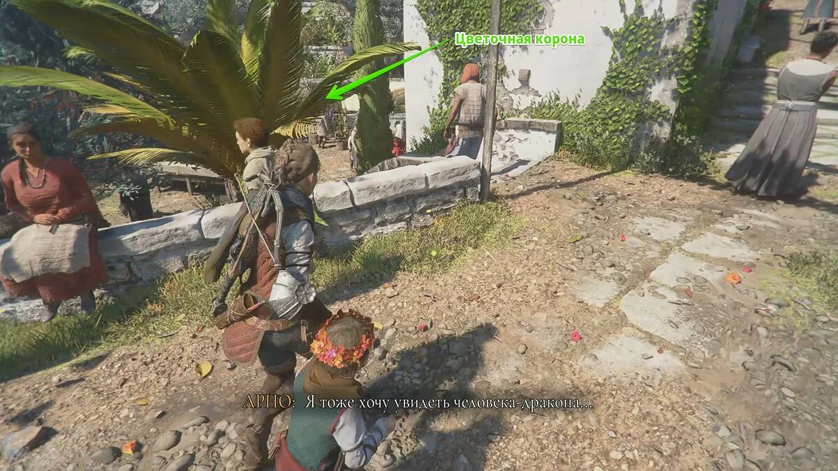 Когда вы окажетесь снаружи, не спешите покидать локацию. Сперва осмотрите окрестности. На небольшом огороде вы найдёте цветок Сингониум.
