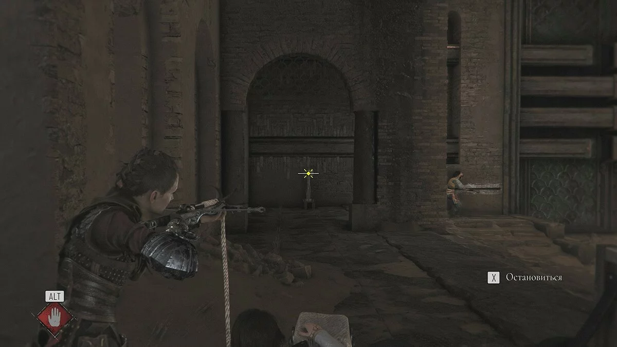 На улице вас заметит стражник. Постарайтесь как можно быстрее атаковать его пращей. Если не успеете, то на высокой сложности он убьёт Амицию с первого попадания.