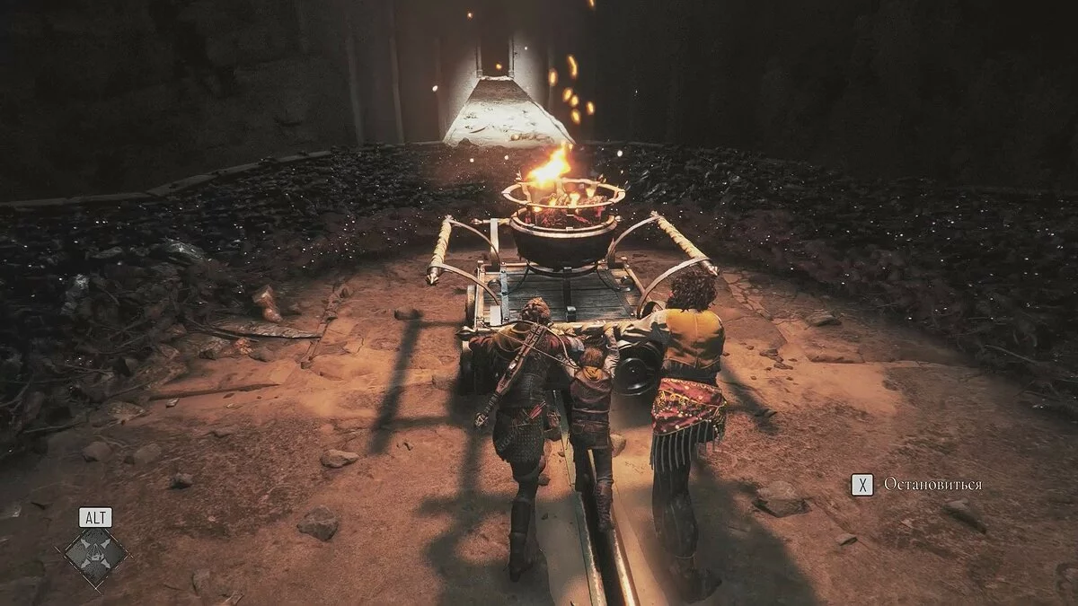 Прикажите Софии поднять рычаг. Повозка спустится вниз и откроет проход. Так вы попадёте в большой зал с тремя телегами и костром по центру. Стреляйте в центральную жаровню, чтобы она подожгла все телеги.