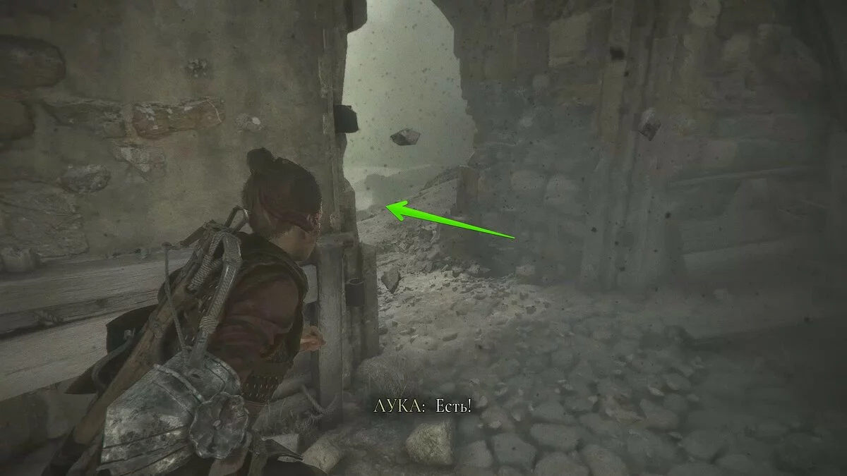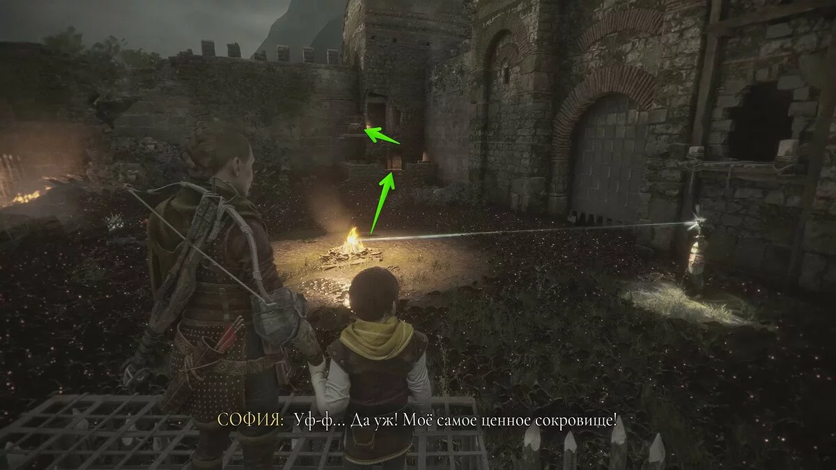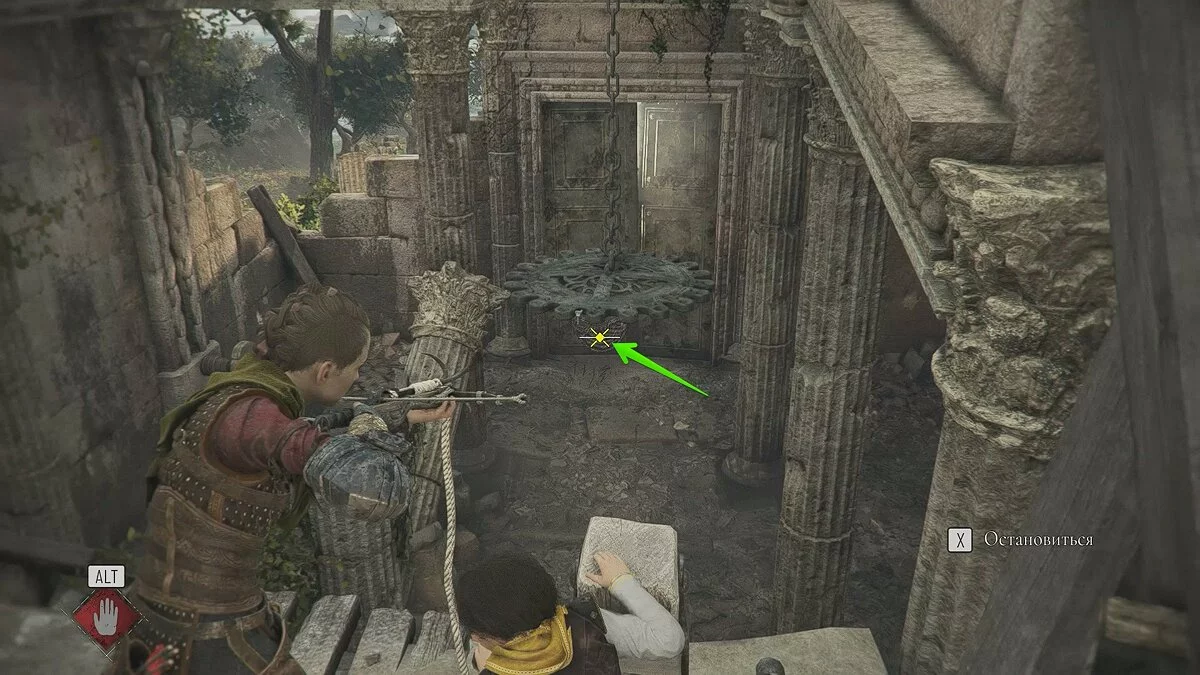 Войдите в полуразрушенное строение и попросите Софью взаимодействовать с рычагом. Она поднимет остатки люстры, а вам нужно отыскать лаз в левой части здания и выстрелить в неё крюком.