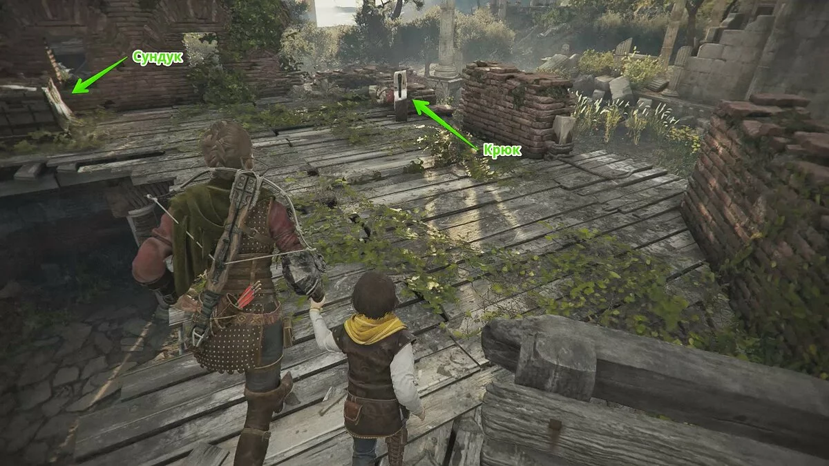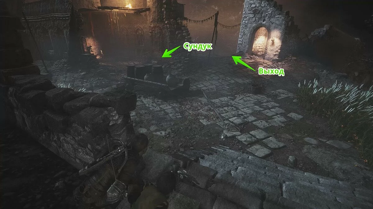 Здесь же вы можете найти секретный сундук. Чтобы осмотреть его, придётся убить всех врагов. Для этого можете воспользоваться арбалетными болтами и другими приёмами. Сундук находится на крыше руин, где нужно выстрелить крюком в дверь здания.