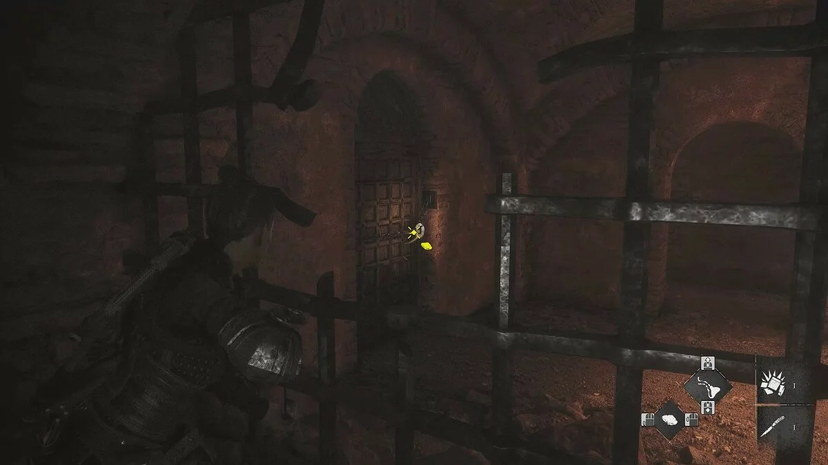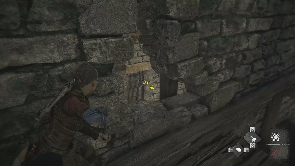 Продолжайте следовать вперёд. Вам предстоит решить небольшую головоломку, чтобы открыть проход. Справа есть запертая дверь. Используйте отверстие в решётке, выстрелите из пращи и откройте её.