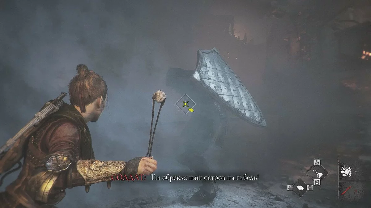 После кат-сцены начнут появляться другие враги. Обычных копейщиков убивайте выстрелами из пращи, а с щитоносцами придётся действовать другим способом.