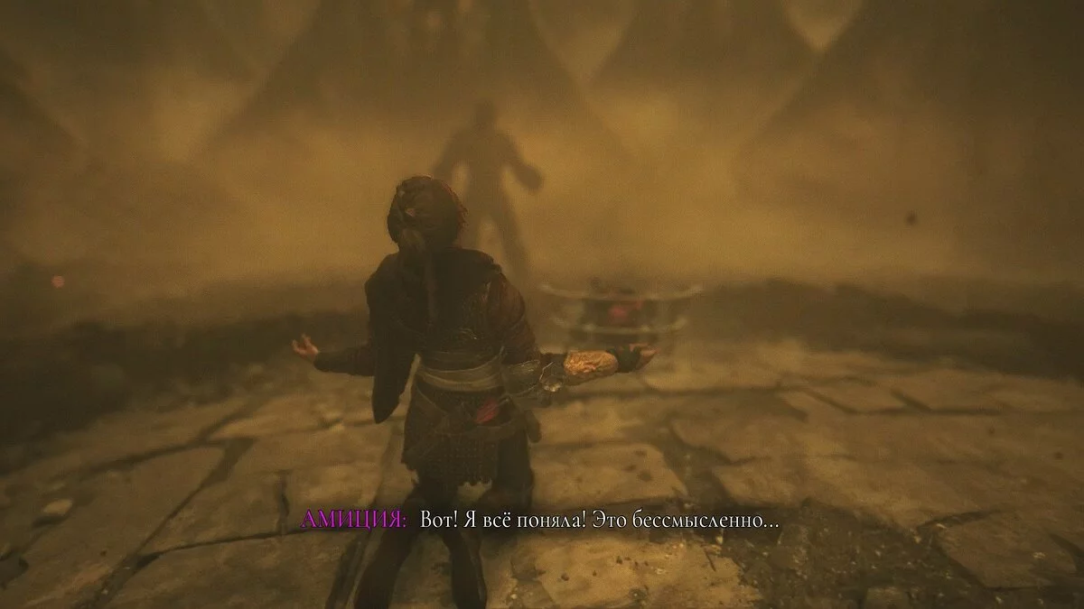 Вскоре Амиция начнёт замедляться и переместится на арену с полчищами крыс. Рядом с героиней стоит жаровня. Игра предлагает расправляться с грызунами, которые собираются в гигантских людей, но не стоит этого делать. Лучше возьмите в руки селитру и сразу же потушите огонь в жаровне.